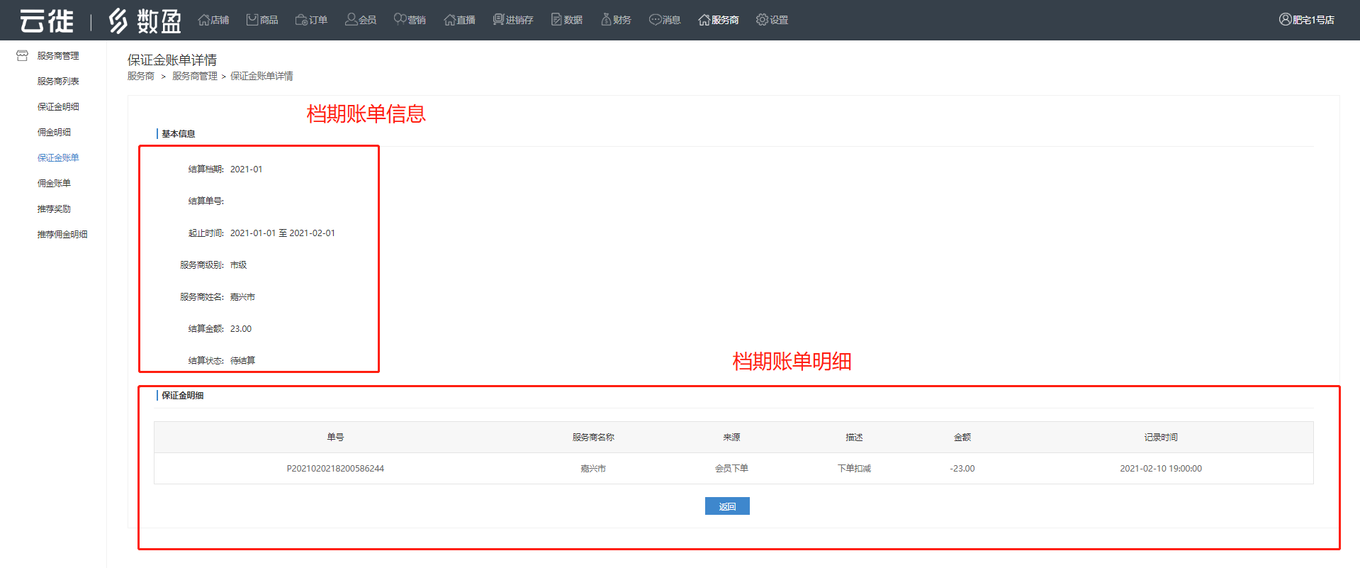 保证金账单一个月底出账一次,为财务每月导出数据进行一次线下打款。一个服务商一个月出一次结算账单,账单包含下级(没有则无)和区域产生订单。当月账单可以按档期查询,比如一月份账单的档期则为2021-01,当商家选择结算当月的账单后,服务商移动端页面的待结算佣金清零(减少),已获得佣金增加。保证金账单分为两种账单,一种是下级服务商加入或者退出时,对上级服务商的保证金扣除的影响。下级加入时扣除掉全部缴纳的金额,当下级(无效)退出时,若在下级区域产生的佣金没有达到下级整个保证金额。则需要把剩余未产生的金额加回上级的未扣减的金额内,并且同样产生的一笔账单,另一种是下级区域产生金额相对与保证款金额的扣减;每产生一笔订单则会产生两笔扣除订单,一笔是市级保证金扣减,一笔区县保证金的扣减。商家可进行切换查看。当下级加入退出以及下级区域订单的扣减与自己参与扣减的保证相等时,【剩余扣减】保证金为0,往后再产生的可扣减的订单系统只展示数据记录。