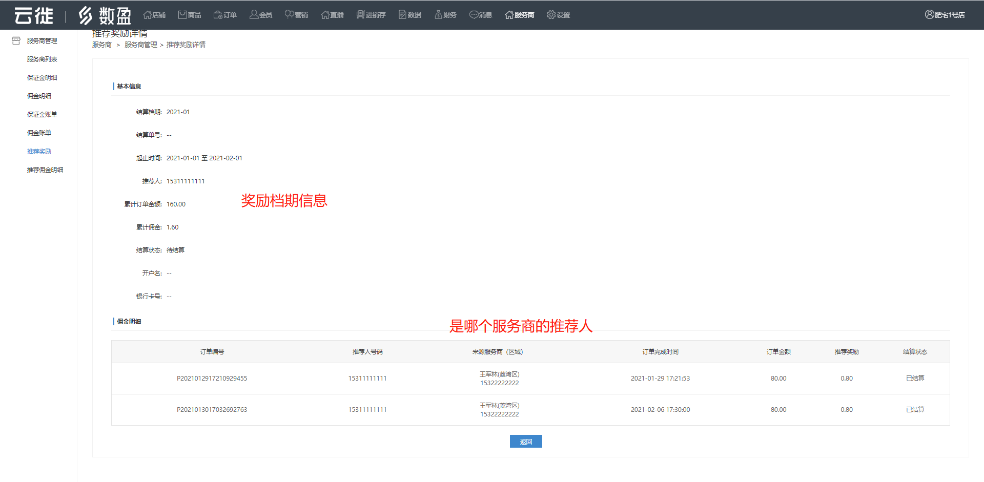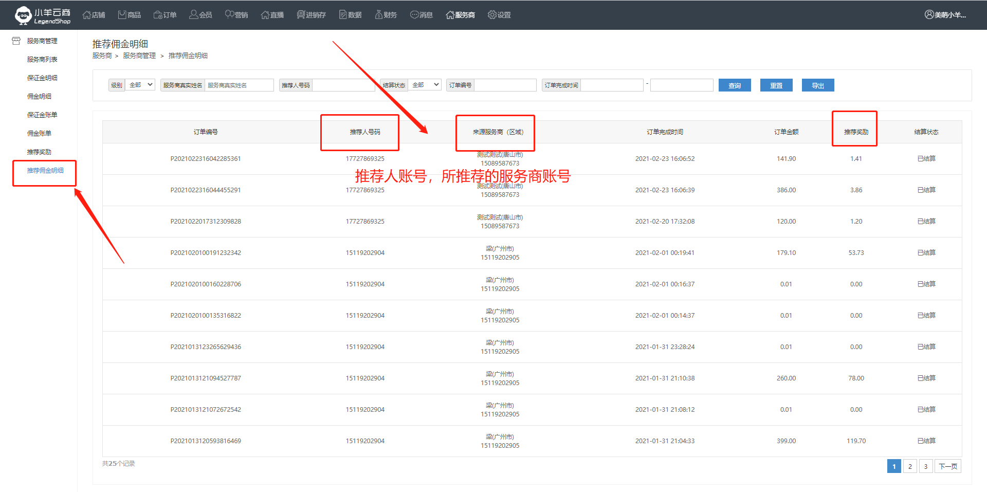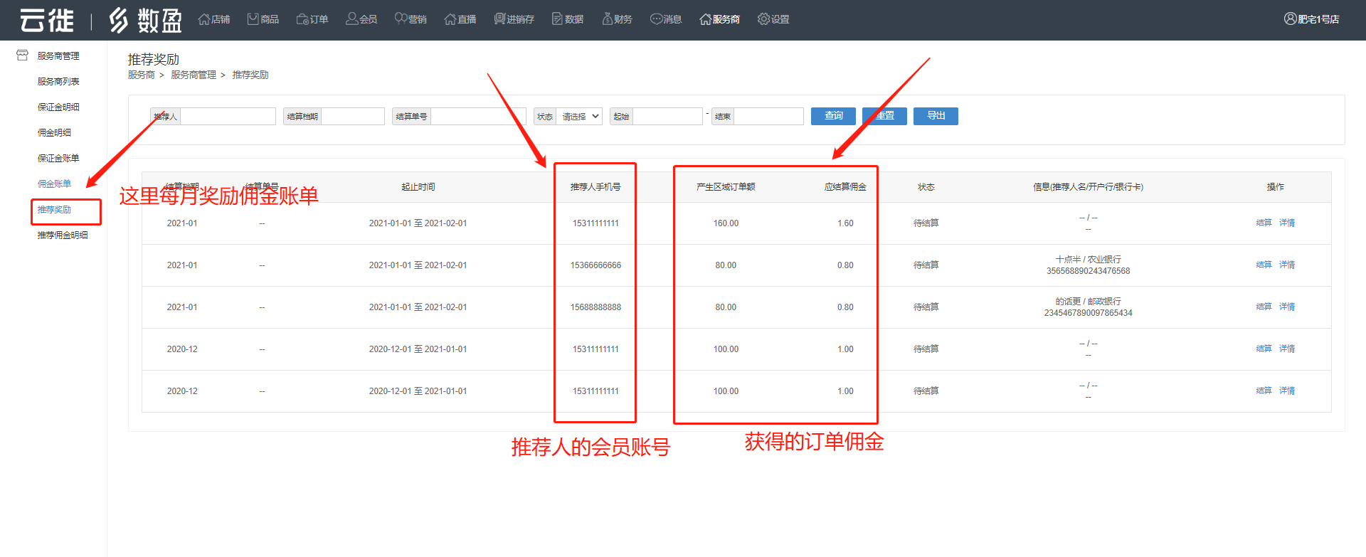 服务商的推荐人能够获得推荐服务商的一定佣金比例。系统每个月统计推荐人获得的佣金明细