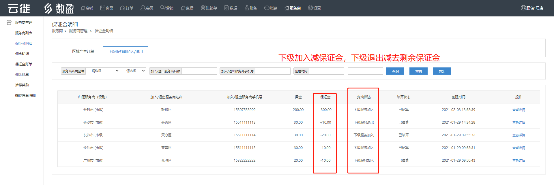 3、查看保证金扣减明细:点击保证金账单菜单→点击区域订单的下级加入/退出→点击查看详情