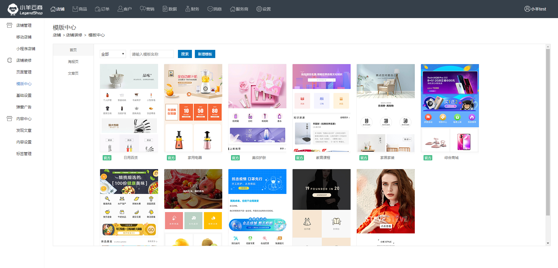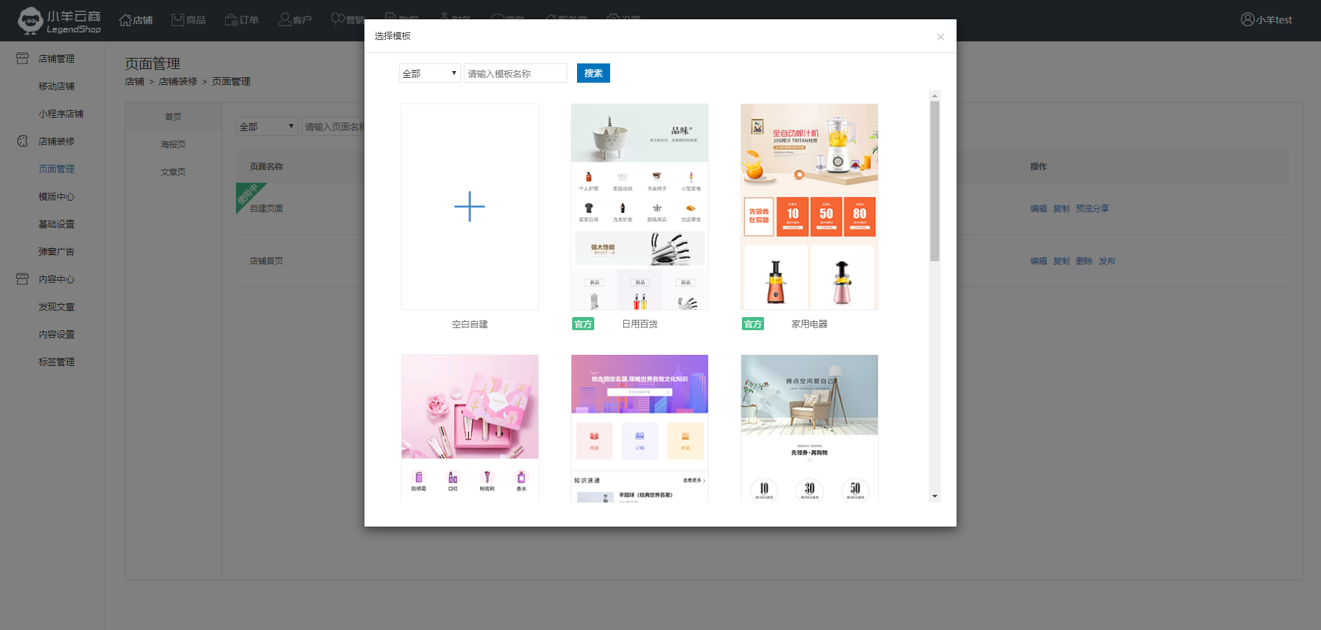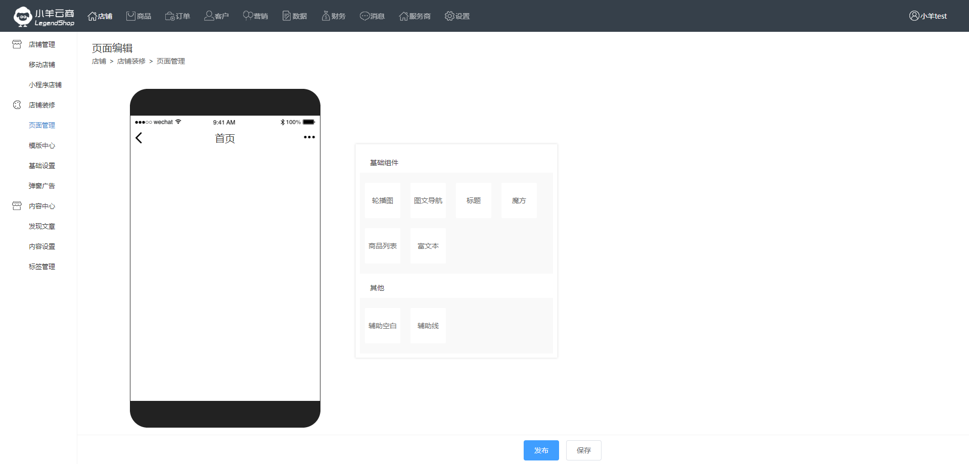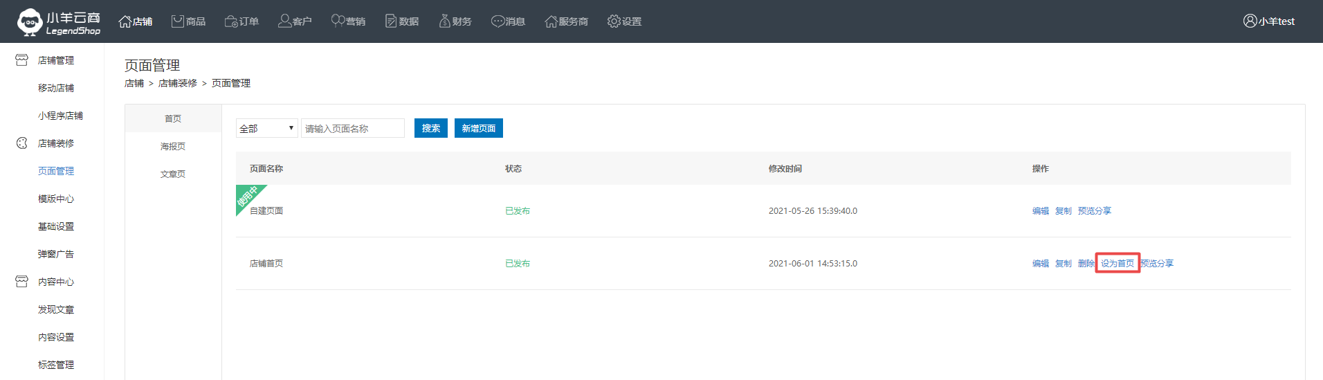 1. 小羊云商页面是可以自定义编辑的,可将首页分类下的页面设为店铺主页;