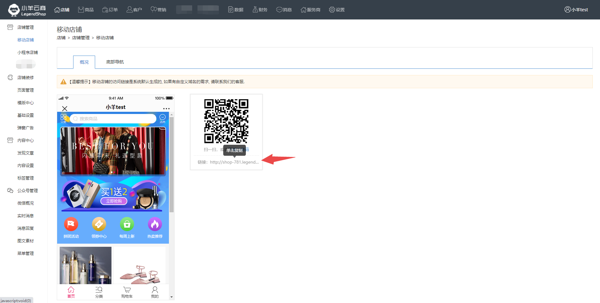 店铺地址可以分为二维码形式和网址形式:二维码可以进行下载,分享给用户;地址单击即可进行复制,分享给用户。