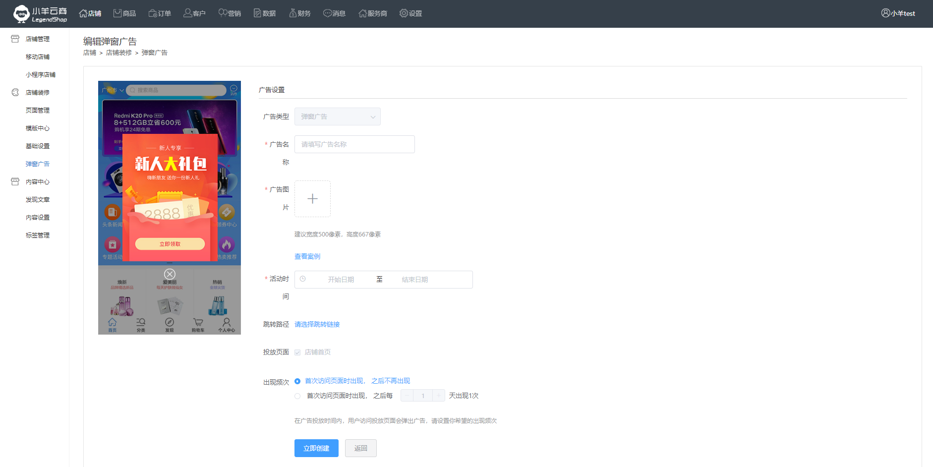 1. 进入店铺主页支持弹窗广告,商家可自由配置弹窗图片和超链接,便于宣传店铺活动和主推商品;