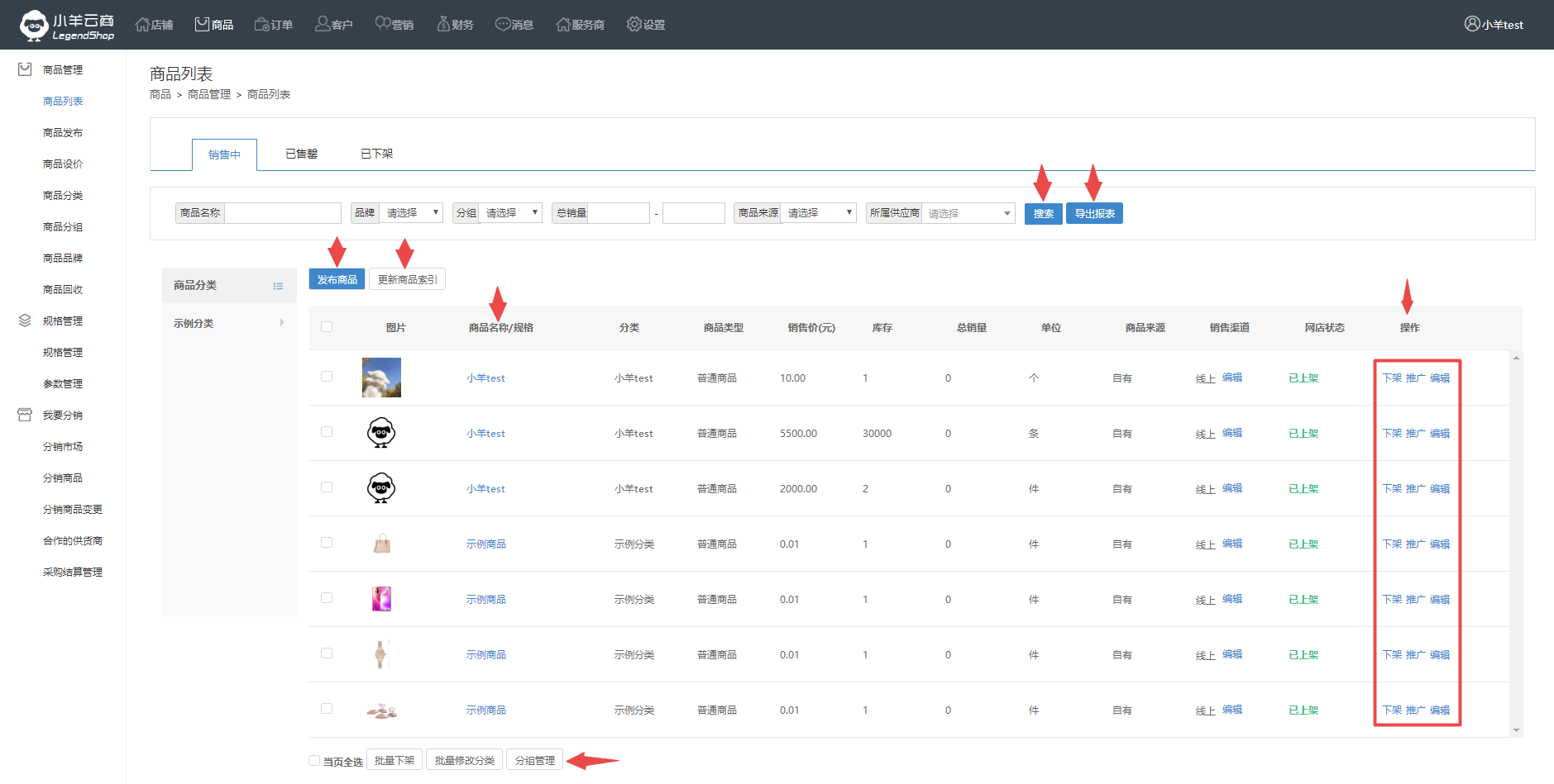 5)批量操作:可以进行批量下架、批量删除、分组管理操作。