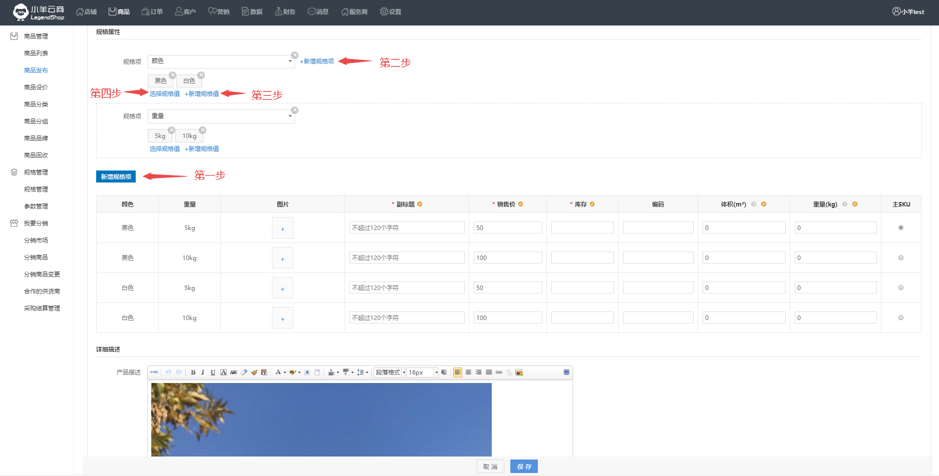 新建商品规格,当商家售卖的商品有不同的规格时,可以增加不同的商品规格,如不同的颜色、不同的价格、不同的体积、不同的重量。