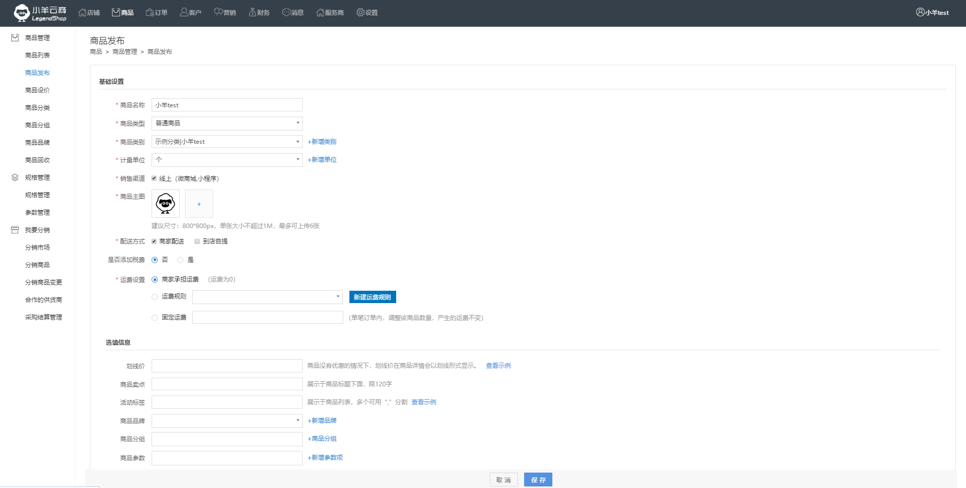 用于商品发布相关设置,包括基础设置、选填信息、规则属性、详情描述。