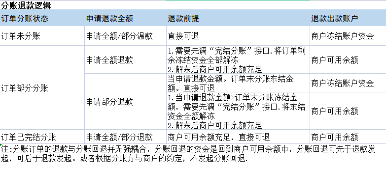 订单分账之前的发生退款,退款资金是从分账冻结资金中出款,未退款的待分账资金可以继续分账;订单分账之后发生退款,在接收方同意分账回退的情况下,资金先可以从接收方(仅限商户类型)的账户中回退至分账方账户,再进行退款 。
