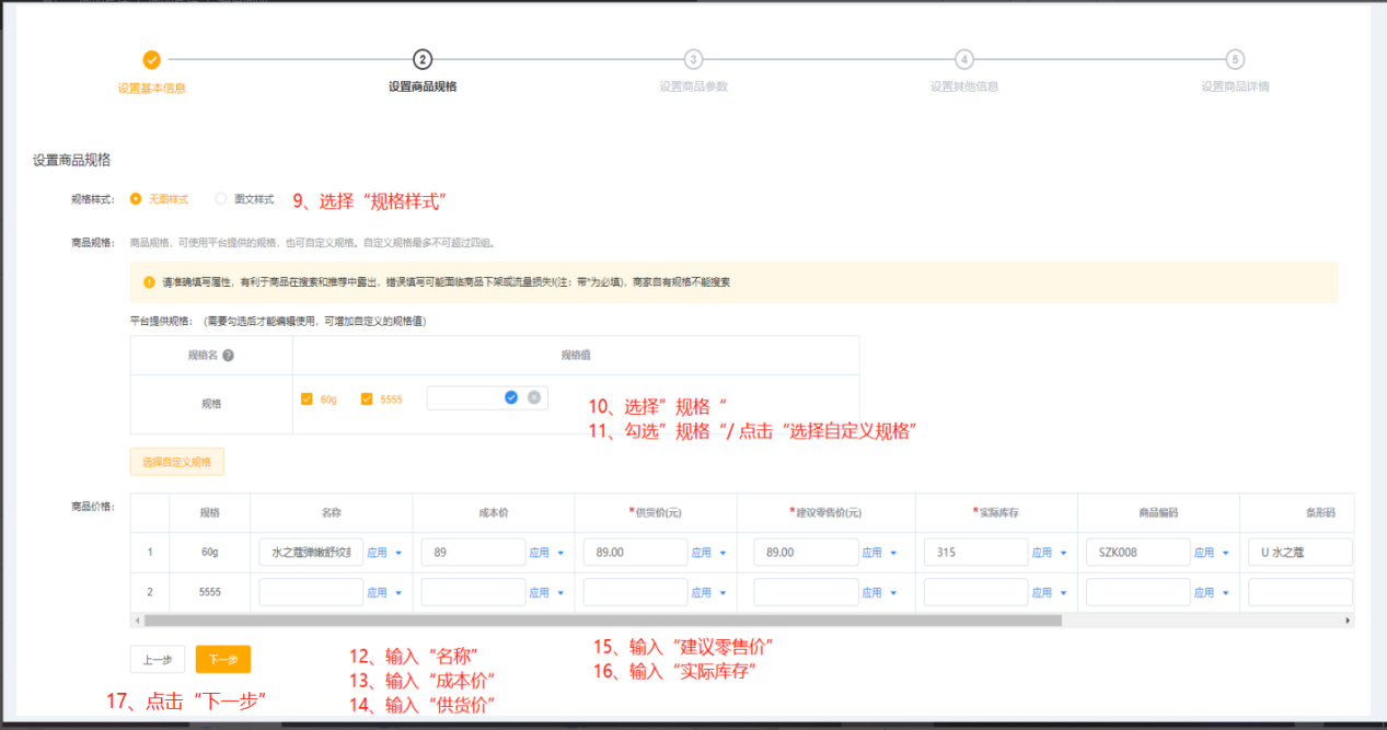 重量/体积:根据选择的模板填写商品的重量及体积/件数
