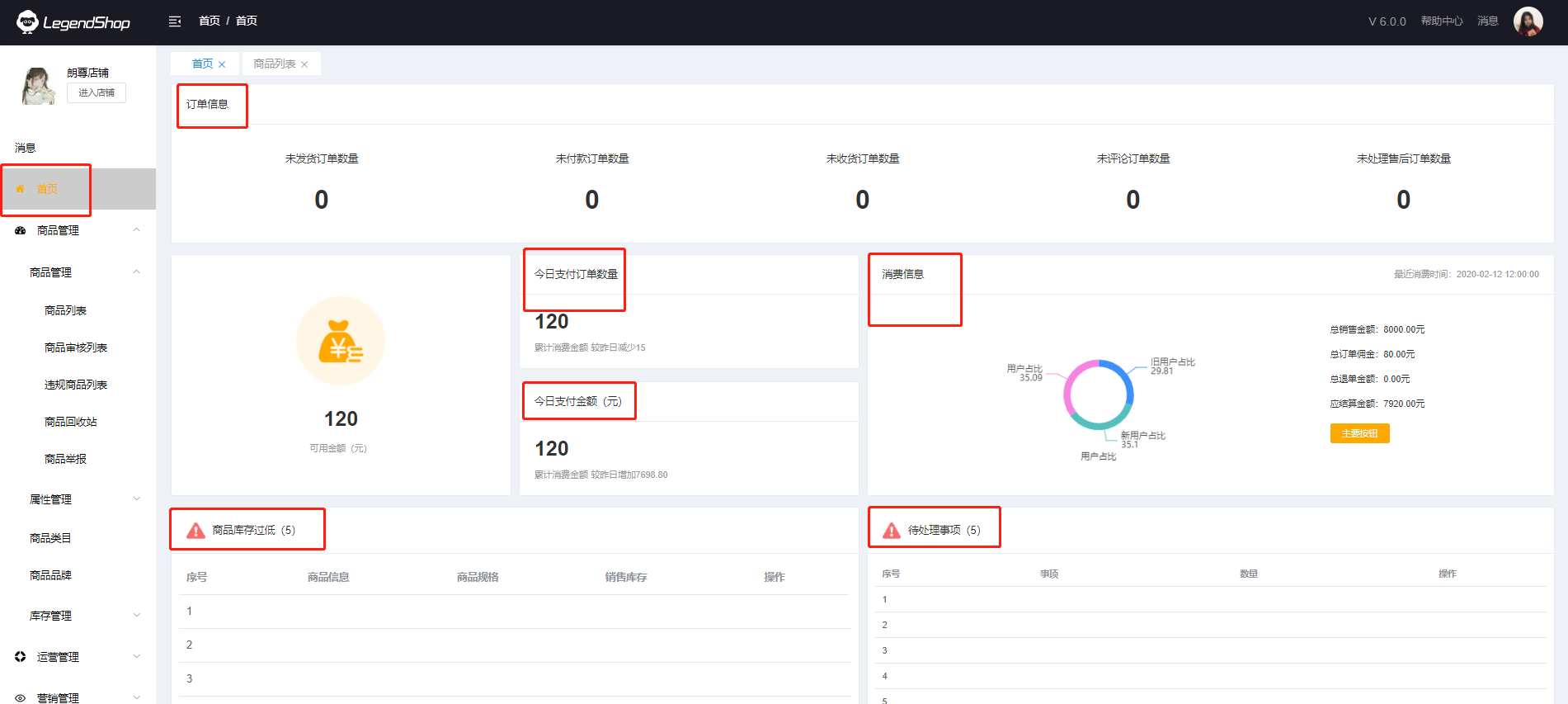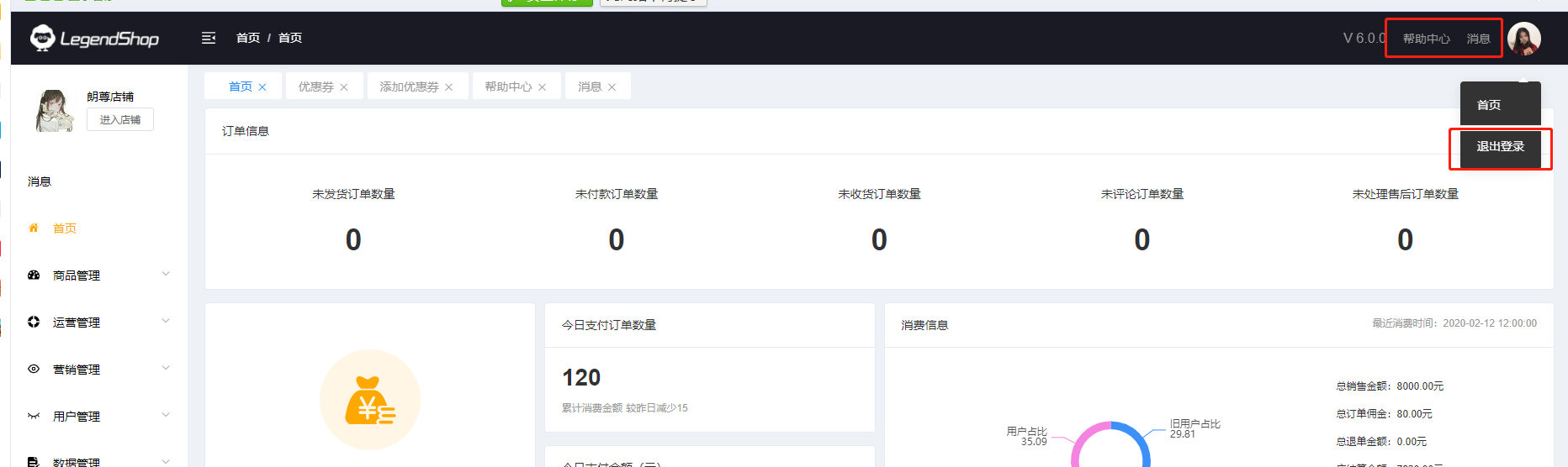 首页展示订单信息、今日支付订单数量、今日支付金额、消费信息、商品库存过低、待处理事项、营销活动情况折线图,顶部有帮助中心、消息、头像。