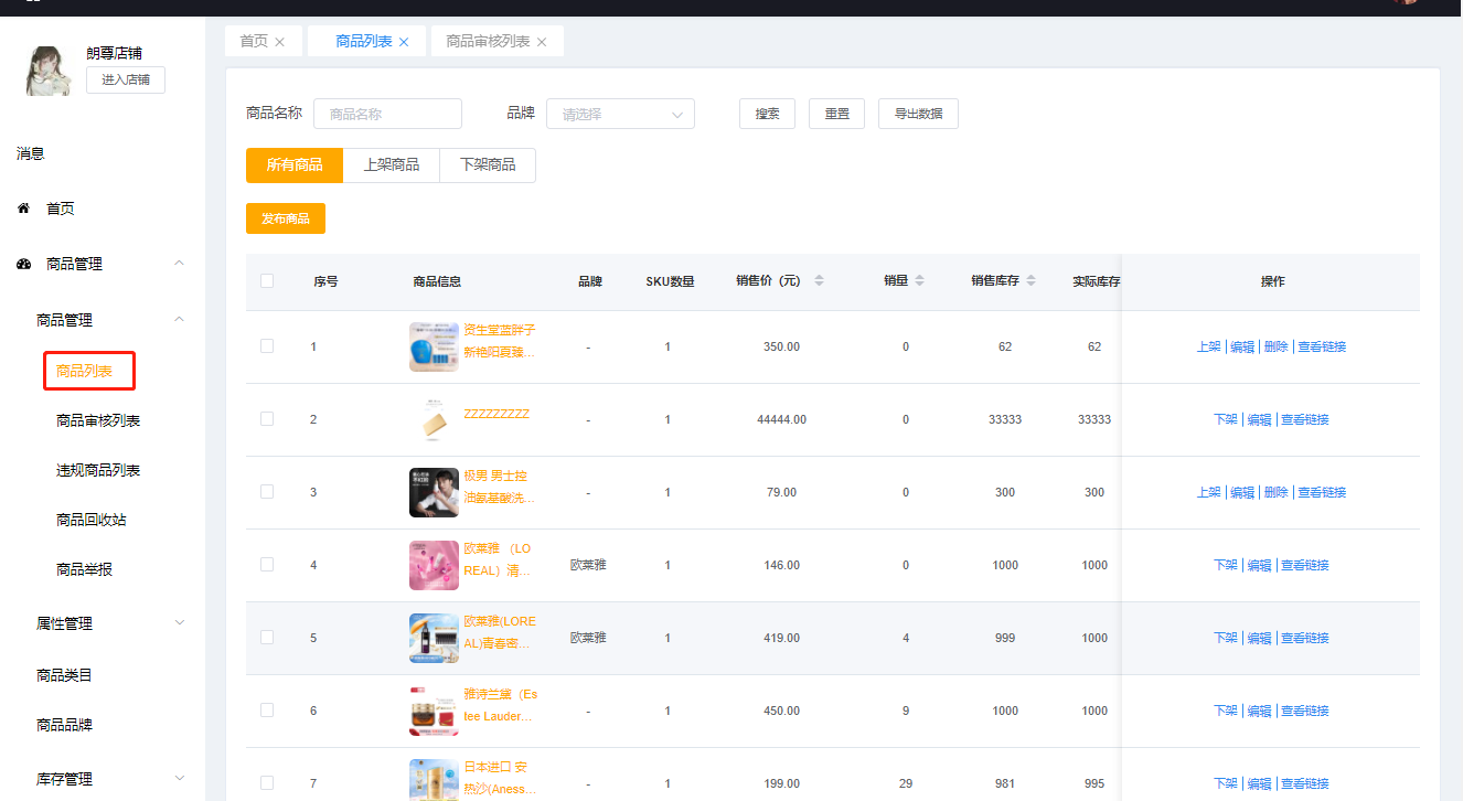 对所有商品及商品状态进行管理。通过商品品牌、商品名称、对商品列表进行搜索。也可导出搜索数据,对商品进行上/下架、编辑、查看链接。