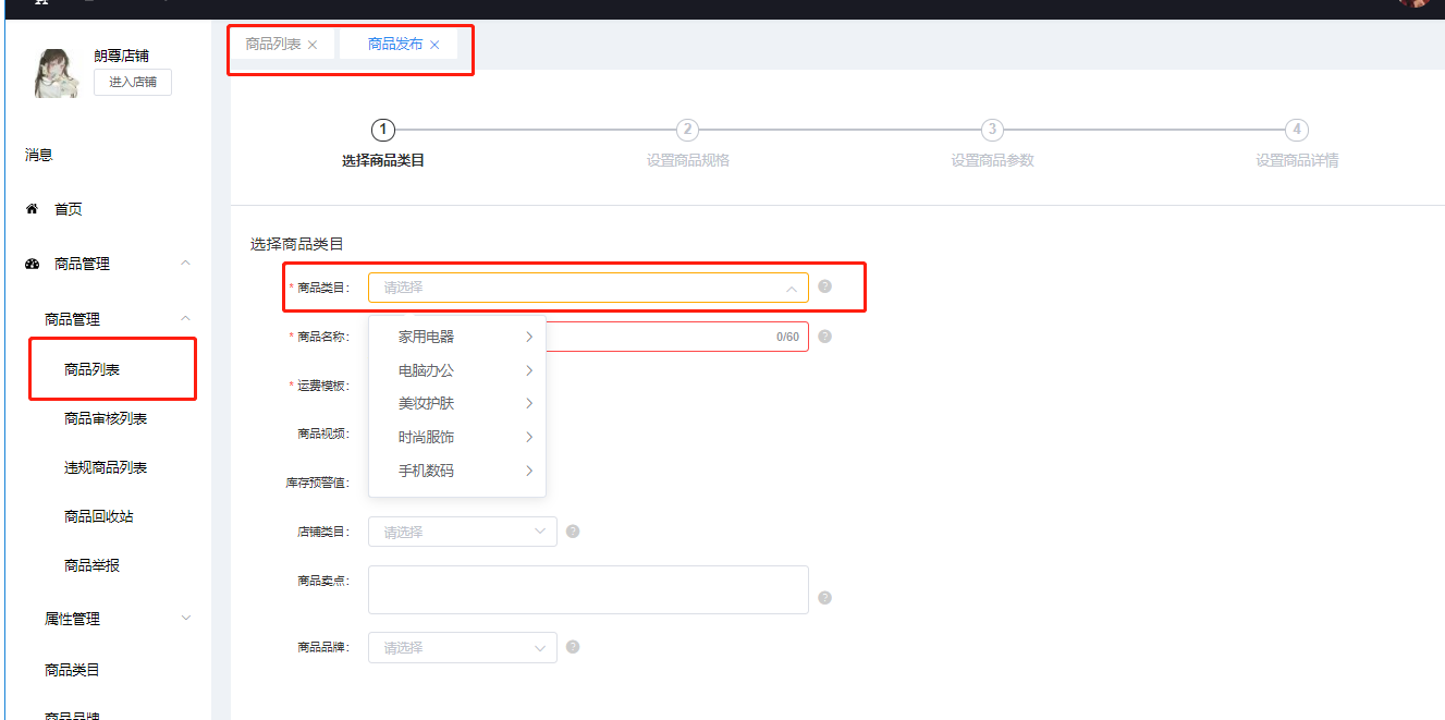 (1)选择商品类目设置商品(商品类目、商品名称、运费模板、商品视频、库存预警、店铺类目、商品卖点、商品品牌)