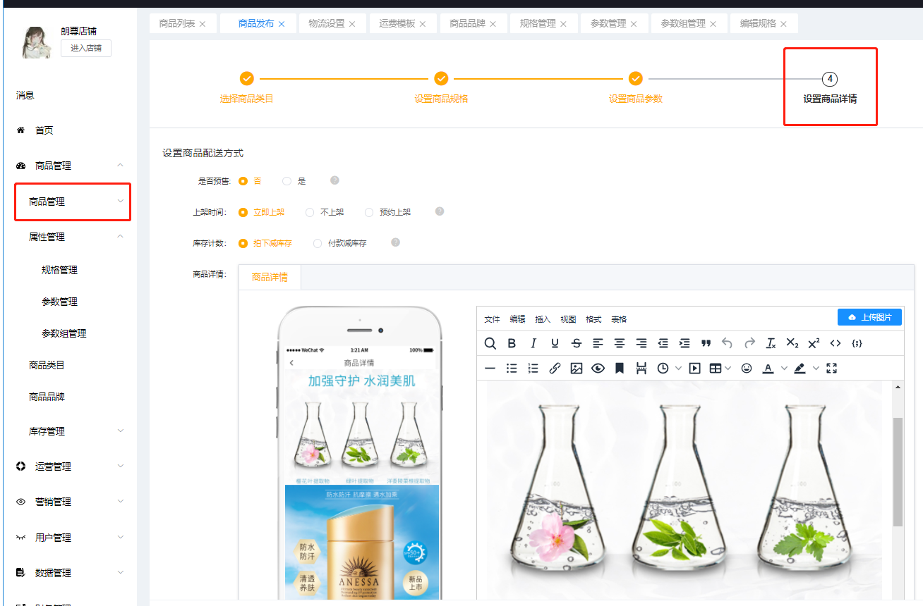 (4)设置商品详情(是否预售、上架时间、库存计算、商品详情)