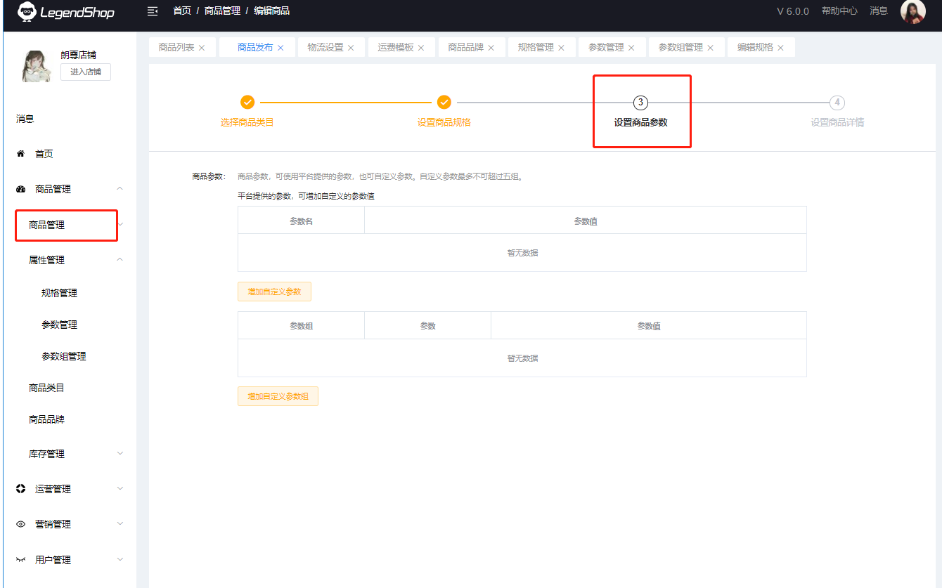 (3)设置商品参数,可以选择平台提供的参数、参数组(由后台管理员在后台商品管理-属性管理设置),也可以选择自定义商品参数、参数组,自定义参数/参数组设置详情见商品管理-参数管理/参数组管理。