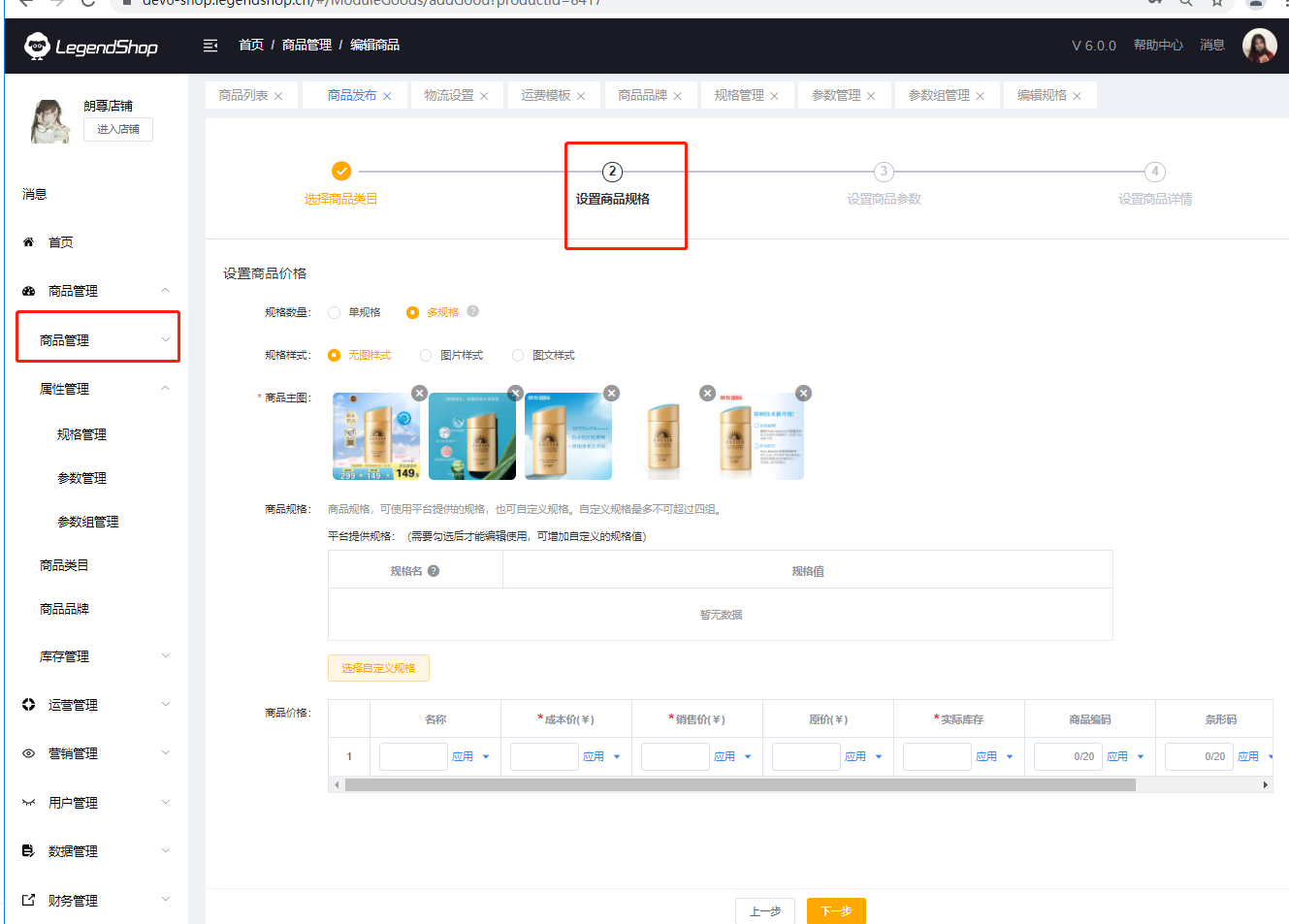 (2)设置商品规格(规格数量(单规格/多规格)、商品主图、商品价格),如选择多规格-商品规格可选平台提供的,也可以也选择自定义规格(自定义规格由商家自己设置,详情见商品管理-属性管理设置)