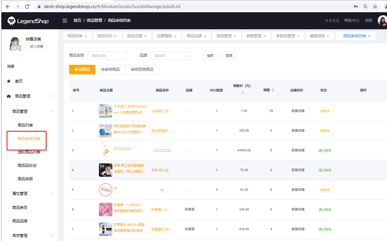 对所有待审核商品、审核拒绝商品进行管理。通过商品品牌、商品名称、对商品列表进行搜索。审核拒绝商品可以进行编辑重新提交审核、删除。