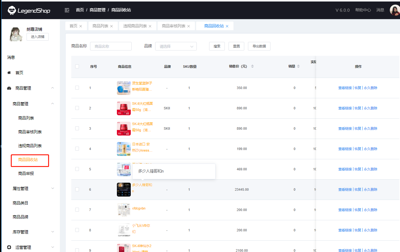 对所有删除商品进行管理。通过商品品牌、商品名称、对商品列表进行搜索、导出数据。可进行查看链接、恢复、永久删除。