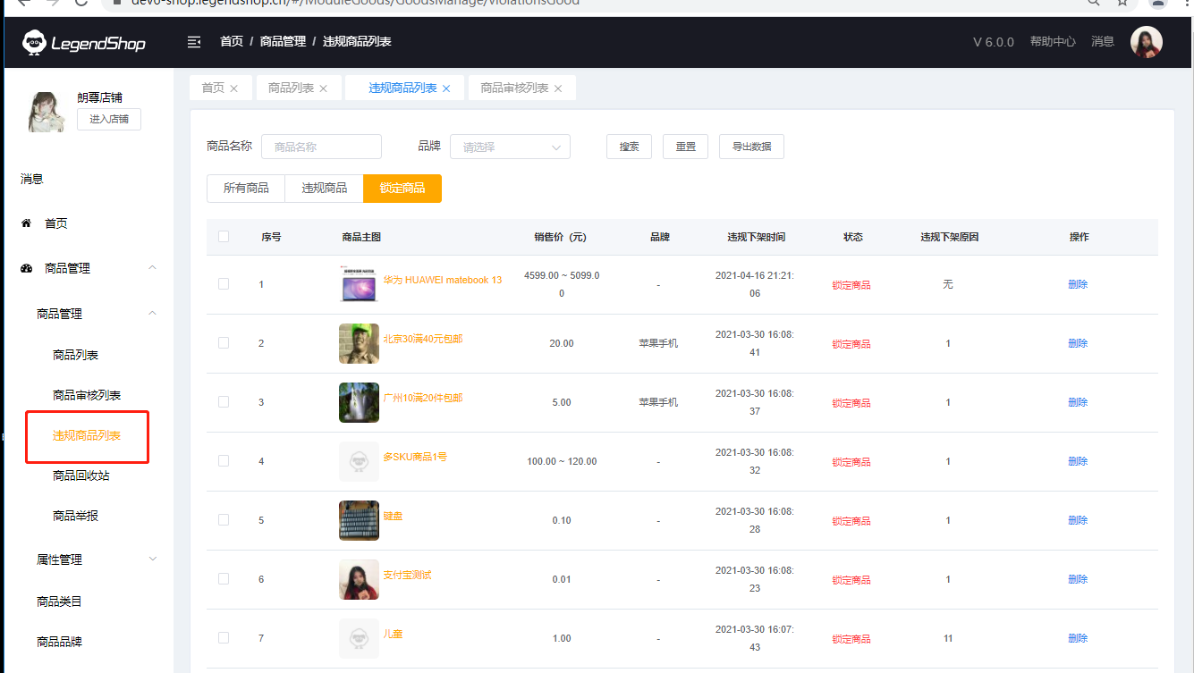 对所有违规商品(商品被用户举报后,平台判定商品违规后商品被下架)进行管理。通过商品品牌、商品名称、对商品列表进行搜索、导出数据。审核拒绝商品可以进行删除。