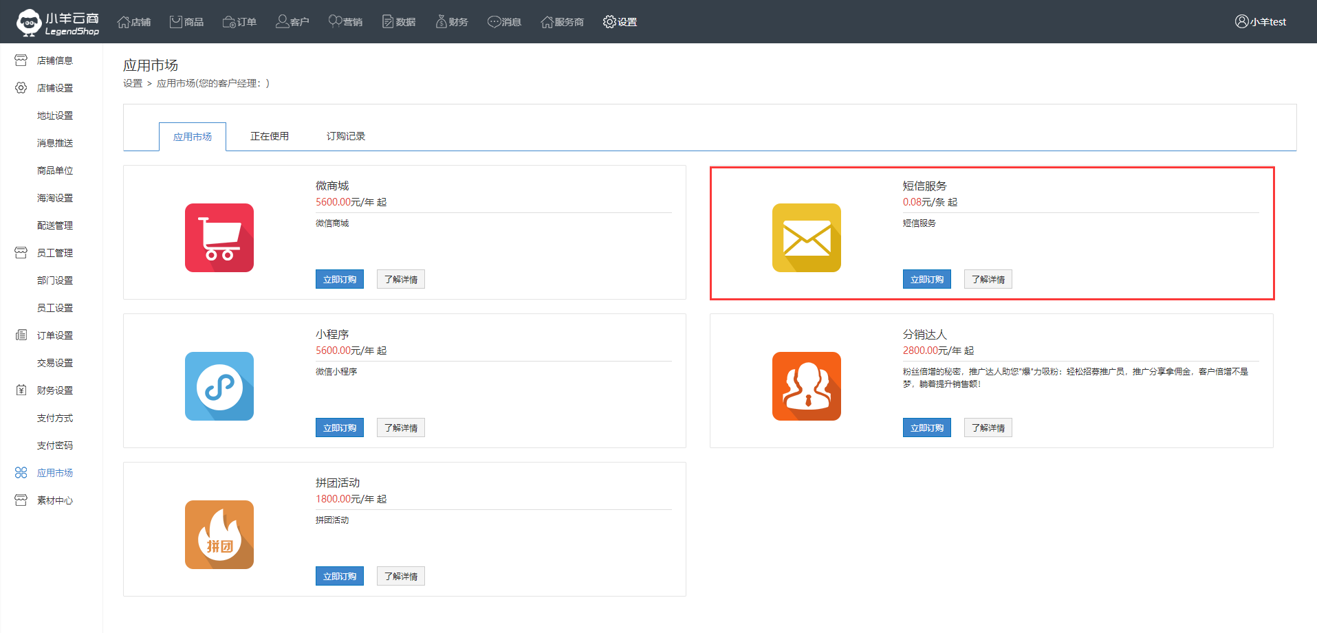 购买短信。路径:登录小羊云商城-系统-应用市场。选择短信服务,点击“立即订购”。