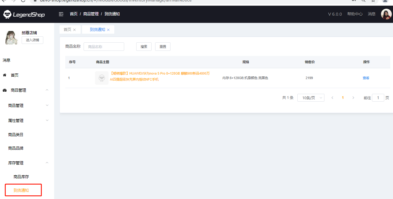 显示所有需要到货通知的商品,可用使用商品名称搜索,可进行查看操作