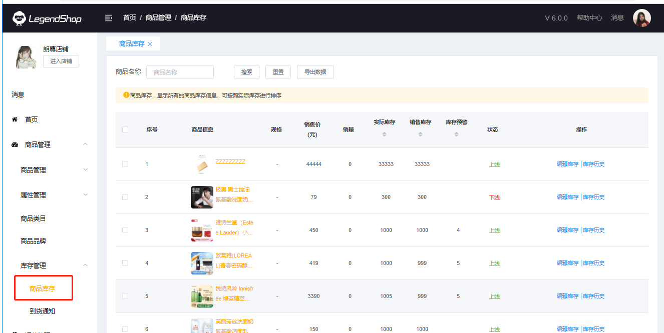 显示所有的商品库存信息,可用使用商品名称搜索,可进行编辑库存、库存历史操作