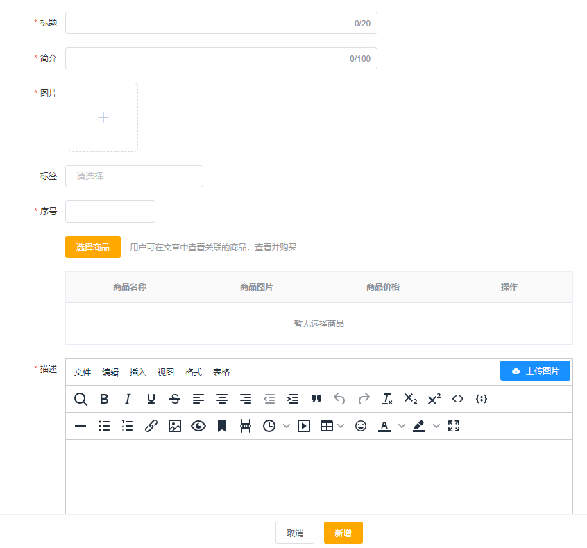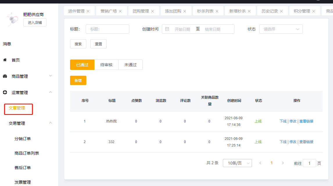 对商家发布的文章进行管理。已通过、待审核、未通过的文章信息。可以通过标题、创建时间状态进行搜索出准确数据。商家可在此页面进行新增、修改、上下线、查看链接等操作。