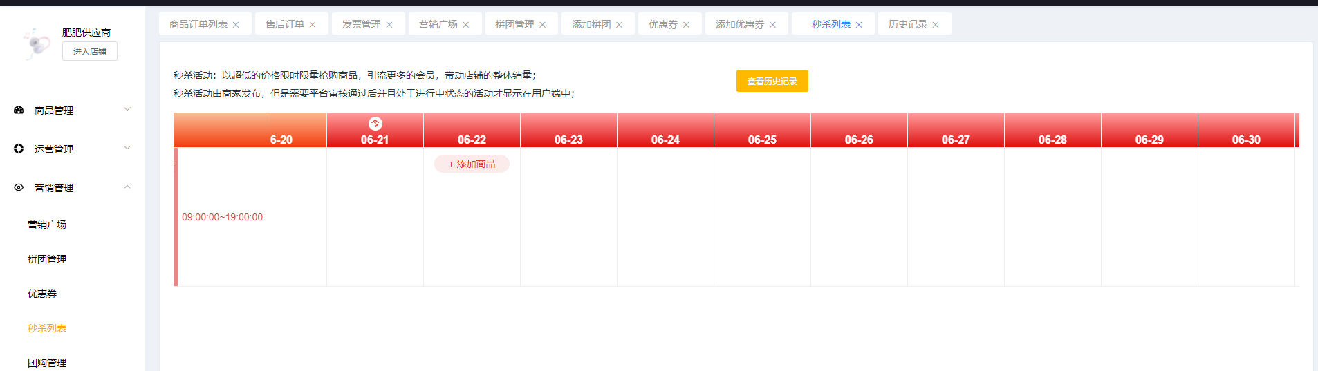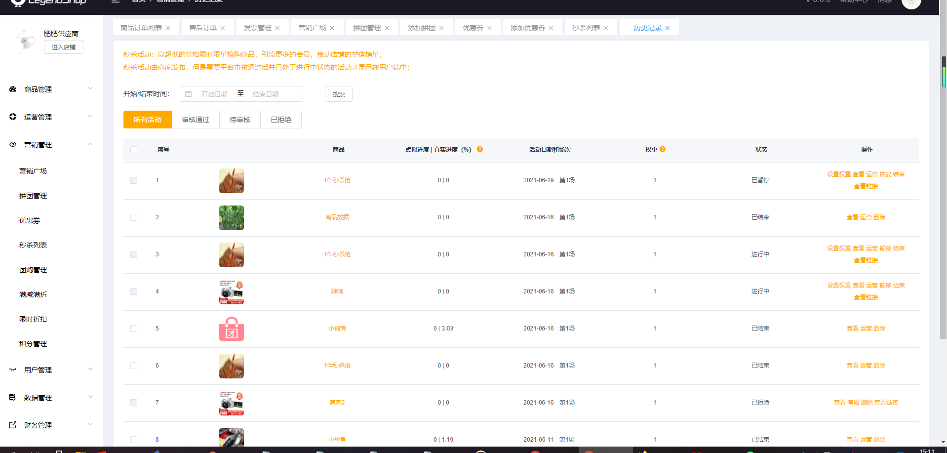 历史记录页面展示所有的秒杀活动,能通过开始|结束时间进行搜索。显示所有活动、审核通过、待审核、已拒绝的秒杀活动,可对活动进行设置权重、查看、运营、恢复、结束、查看链接等操作