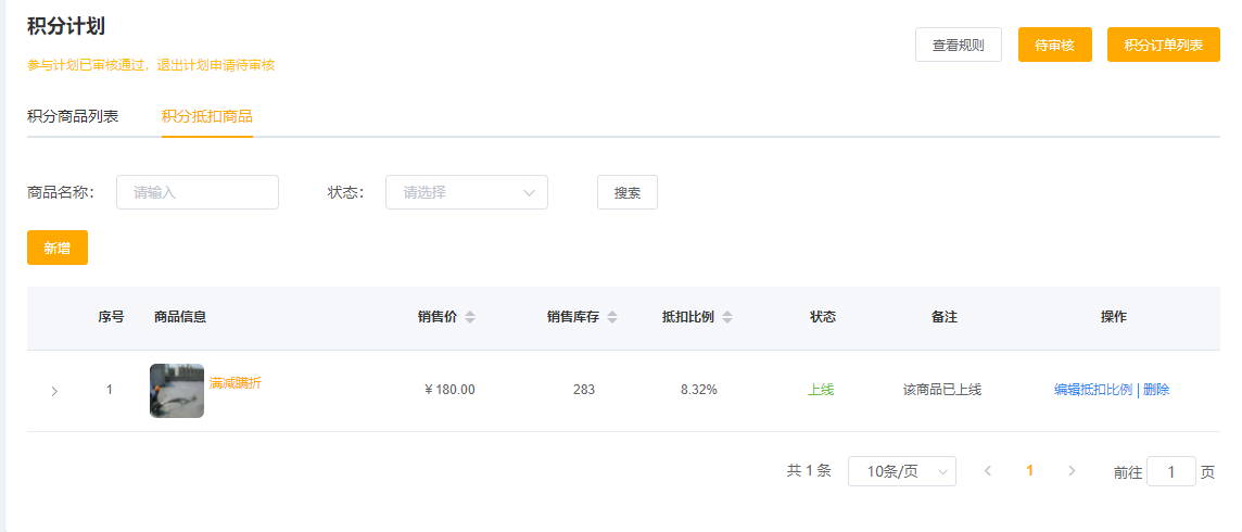 该页面增加积分抵扣商品,可通过商品名称、类型搜索。可对活动进行编辑抵扣比例、删除等操作