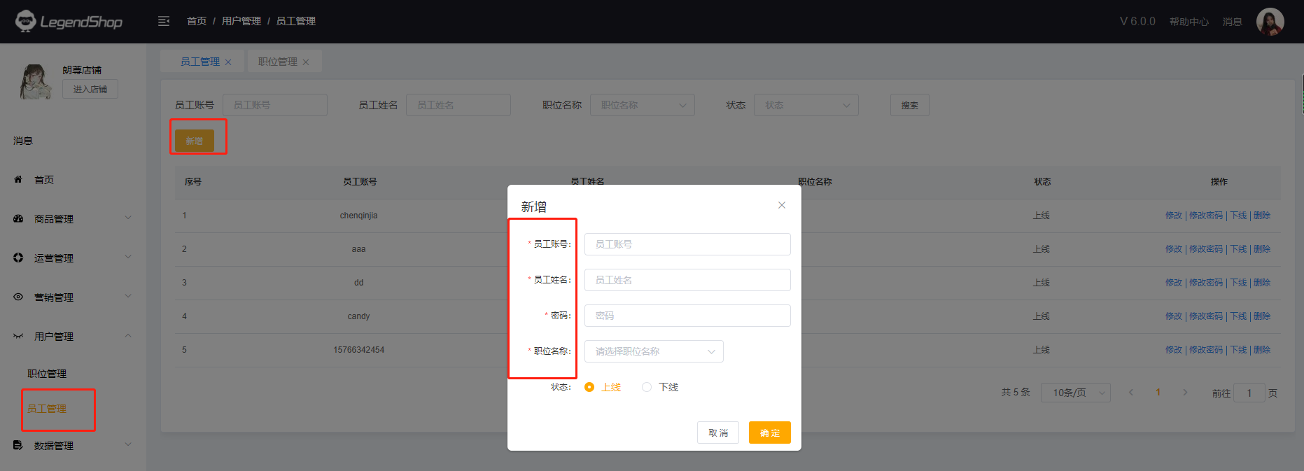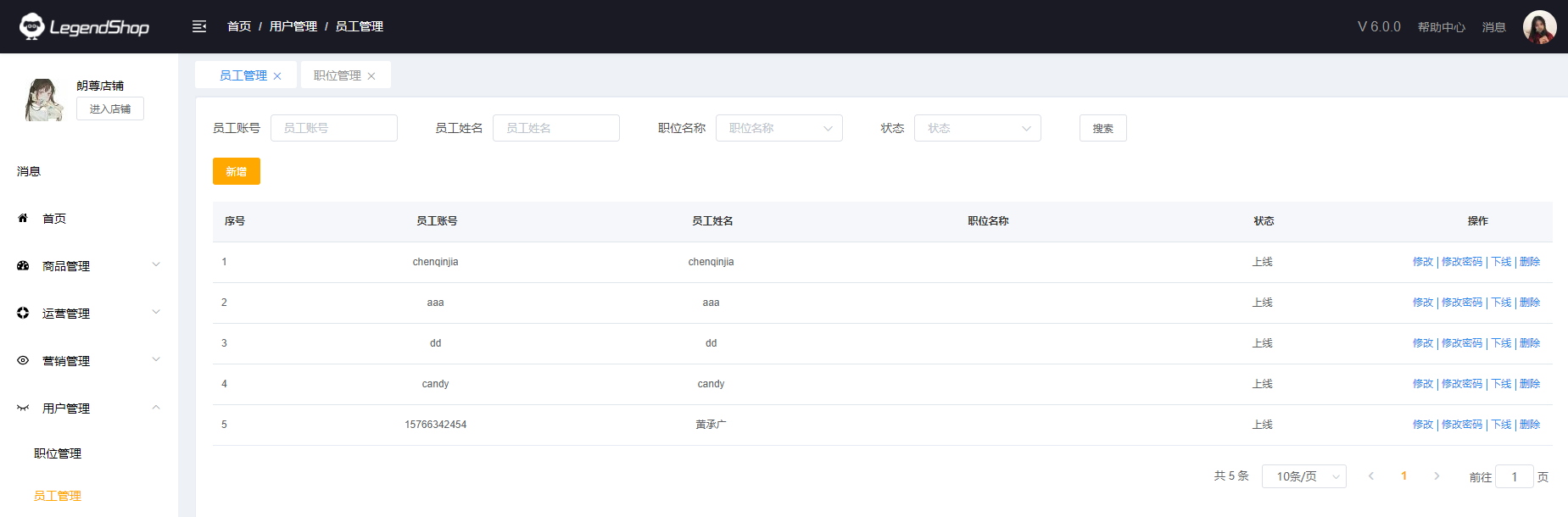 此页面显示所有员工的账号、职位。可用员工账号、姓名、职位、状态搜索,也可对员工账号进行修改、修改密码、下线、删除操作。