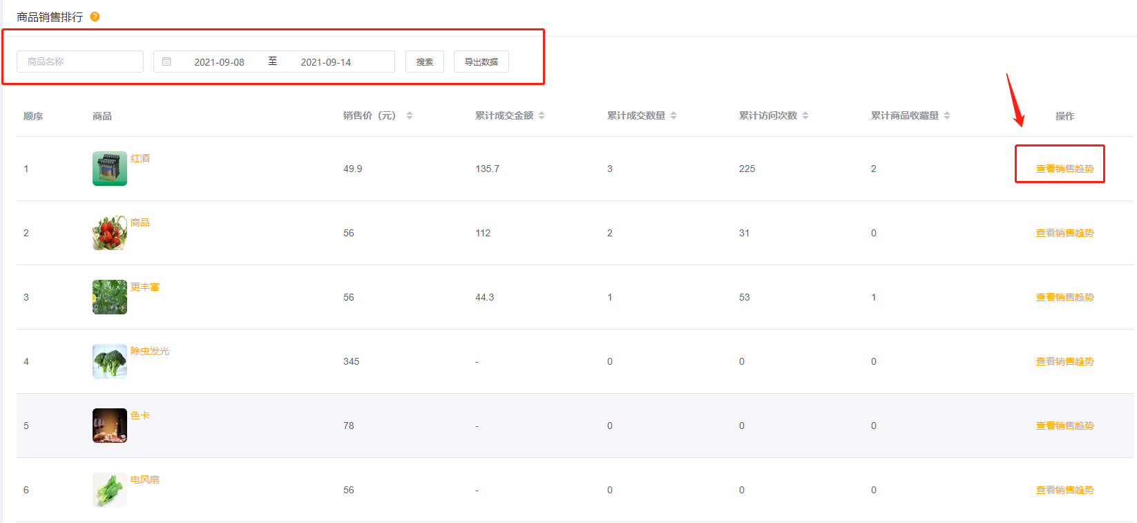 (2)商品销售排行:展示销售排行商品,并能查看销售趋势。可商品名称、日期、导出数据等操作