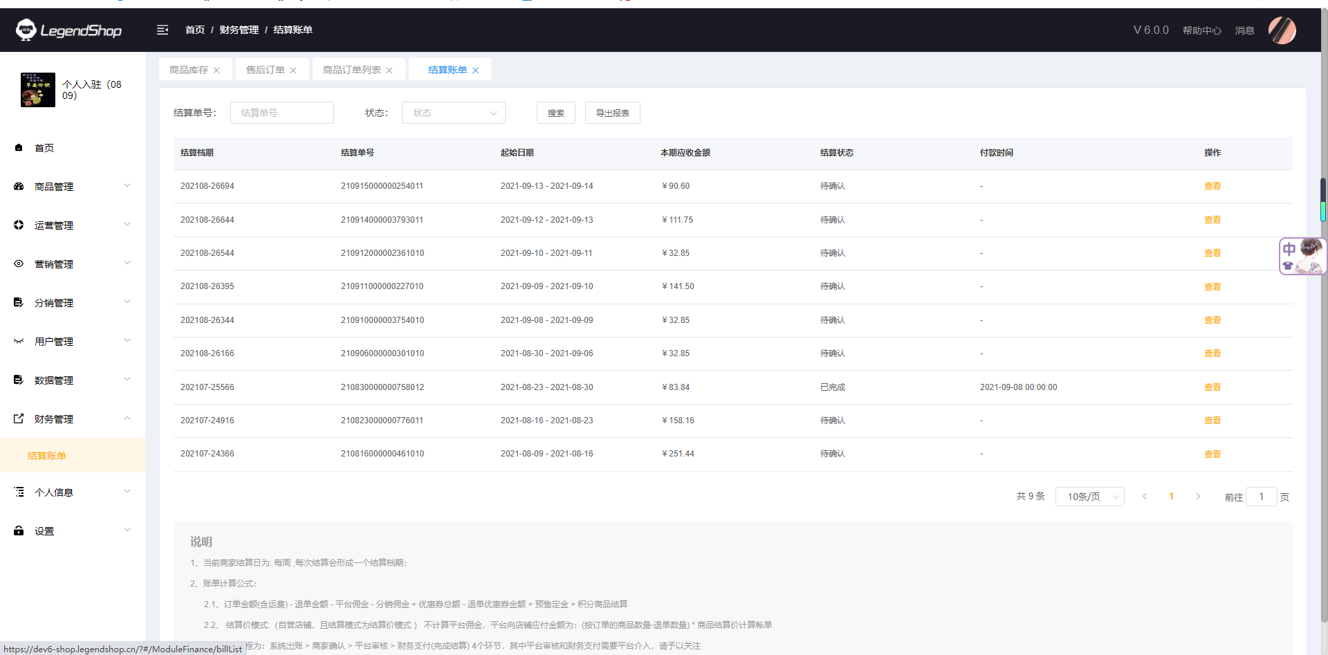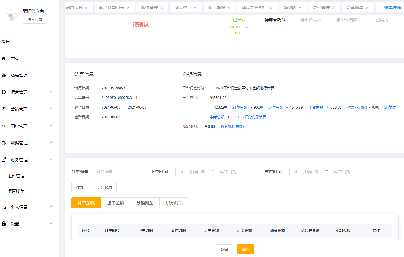 该页面管理结算账单数据,并能通过结算单号、状态进行搜索能能导出报表。能查看、确认结算账单等操作: