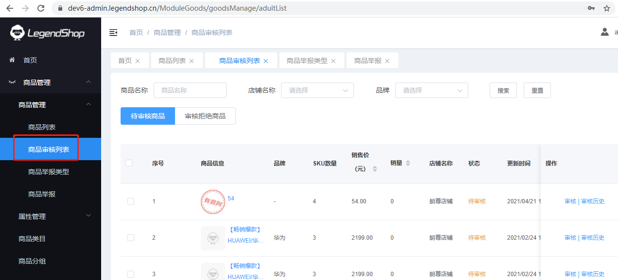 该页面对所有待审核商品、审核拒绝商品进行管理。通过店铺名称、商品品牌、商品名称、对商品列表进行搜索,对商品进行审核、查看审核历史。