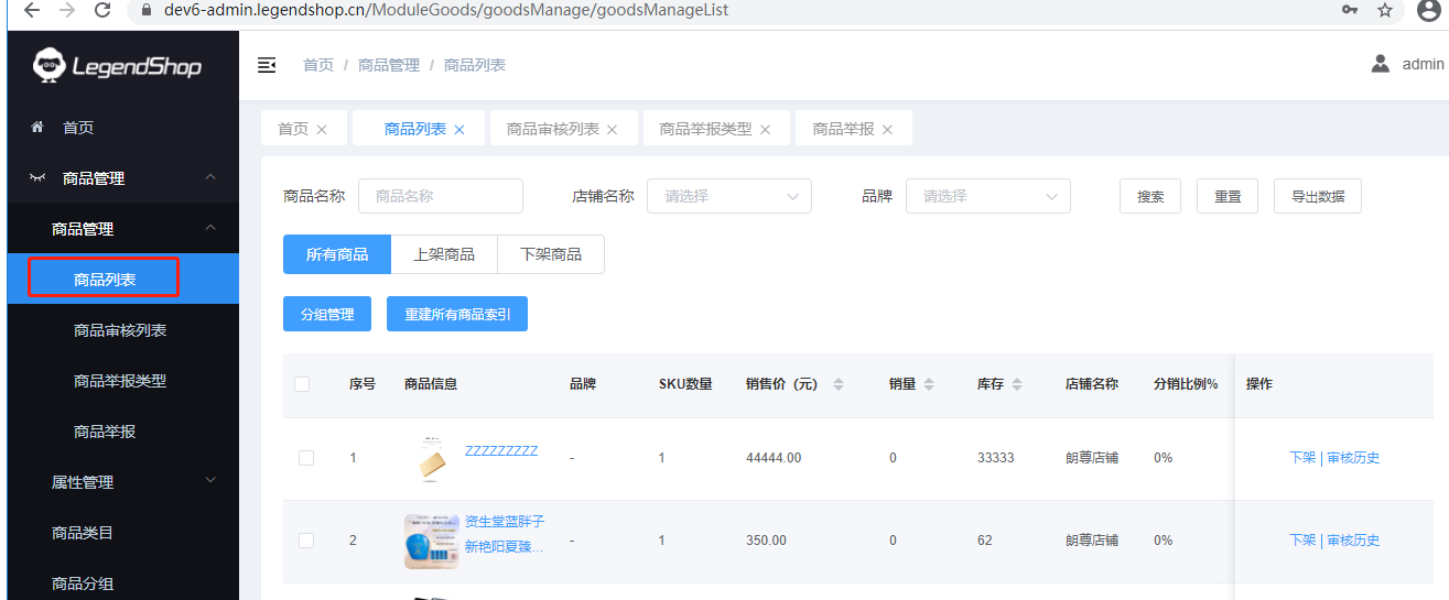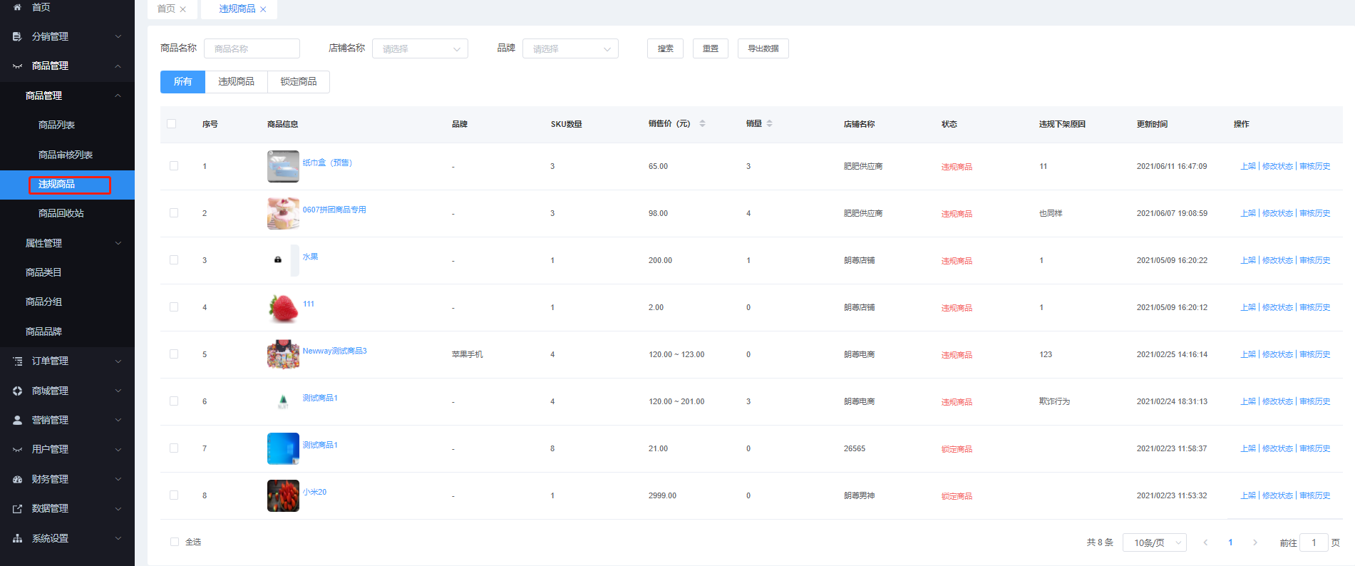 该页面对所有违规商品进行管理。通过商品名称、店铺名称、品牌进行搜索。可对上架、修改状态、审核历史等操作 显示所有、违规商品、锁定商品。