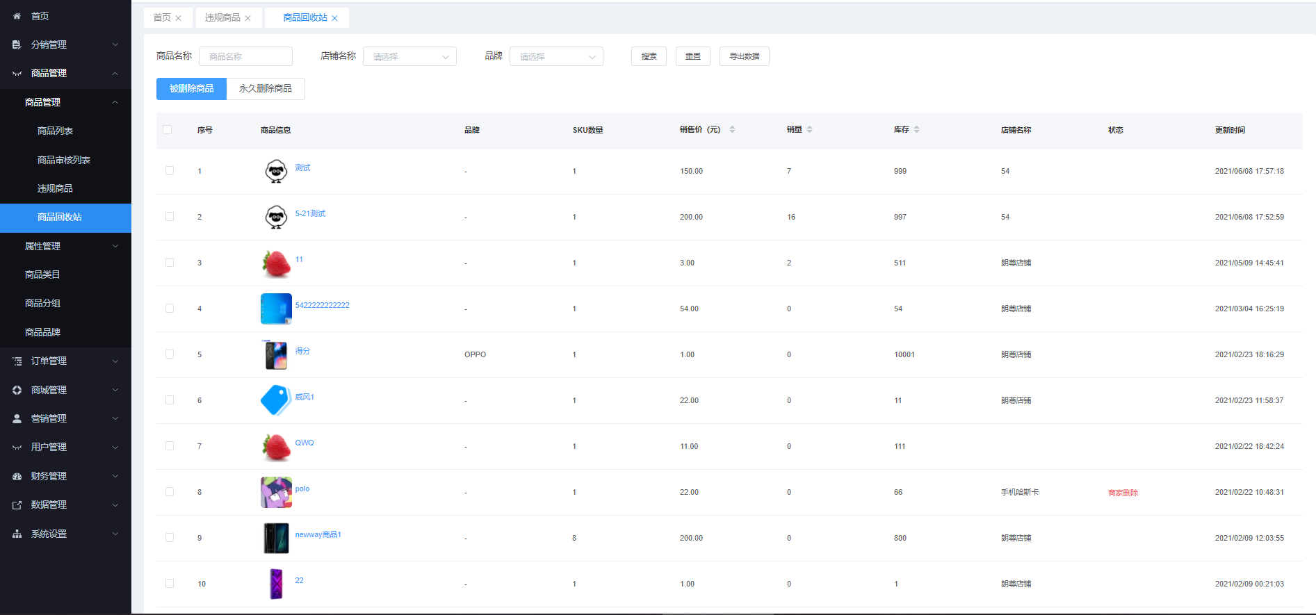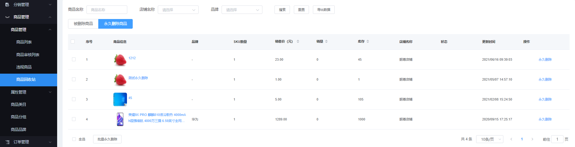 该页面对删除的商品进行管理。通过商品名称、店铺名称、品牌进行搜索。可永久删除、批量永久删除、导出数据、重置搜索框条件。
