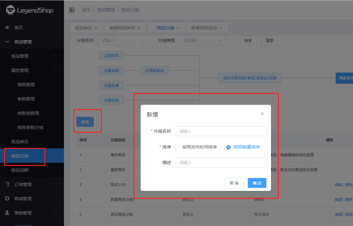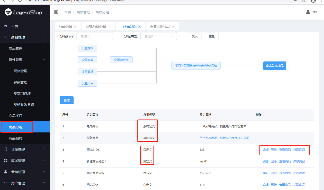 商品分组的分组类型,分为系统定义和自定义,自定义为管理员新建,新建后,在商品列表勾选商品,进行分组管理,在商品分组列表可移除商品。可以使用分组名称、分组类型搜索。