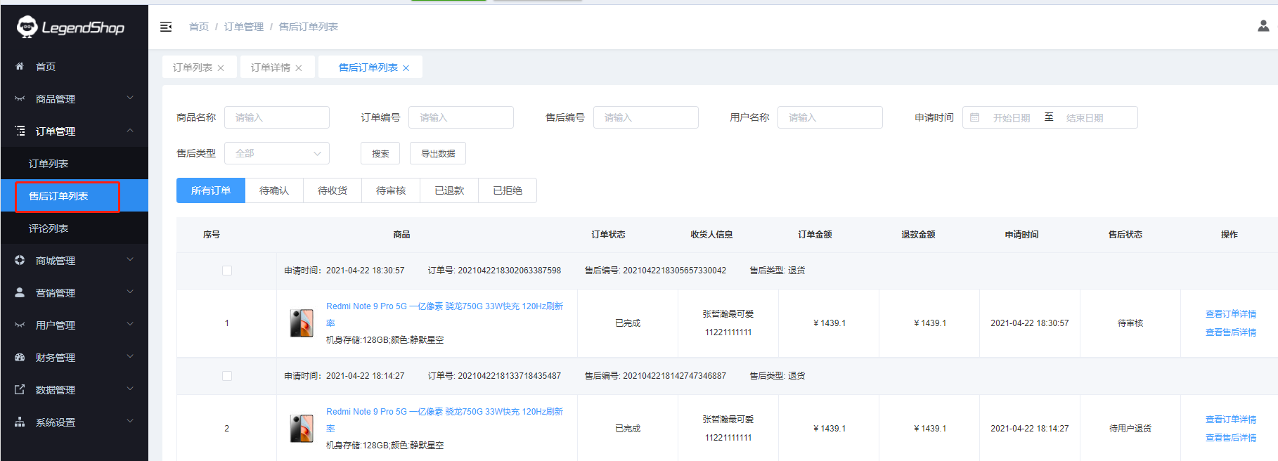 该界面展示了售后订单的各种状态(待付款、待发货、代审核、已退款、已拒绝),并能对订单进行查看订单详情、查看售后详情、审核操作。并能根据商品名称、订单编号、售后编号、用户名称、申请时间、售后类型进查询及导出搜索数据。