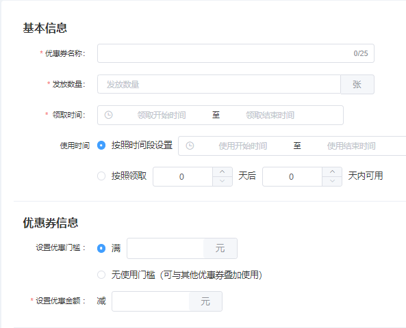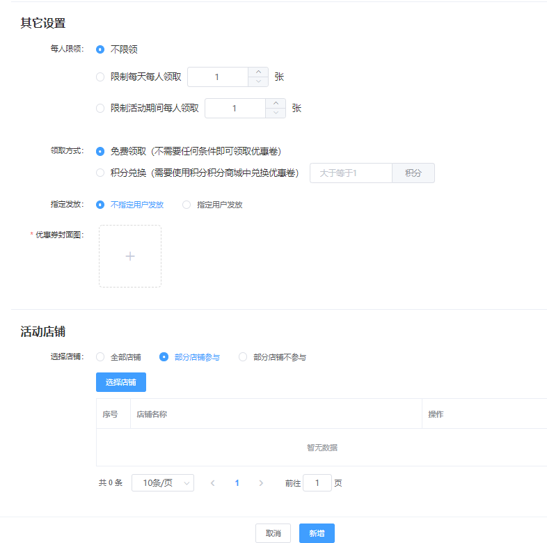 点击“新增”-输入“优惠券名称”-输入“发放数量”-选择“领取时间”-选择“使用时间”-输入“优惠门槛”-输入“优惠金额”-选择“每人限领”-选择“领取方式”-上传“优惠券封面图”-选择“活动店铺”