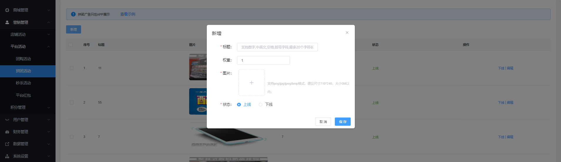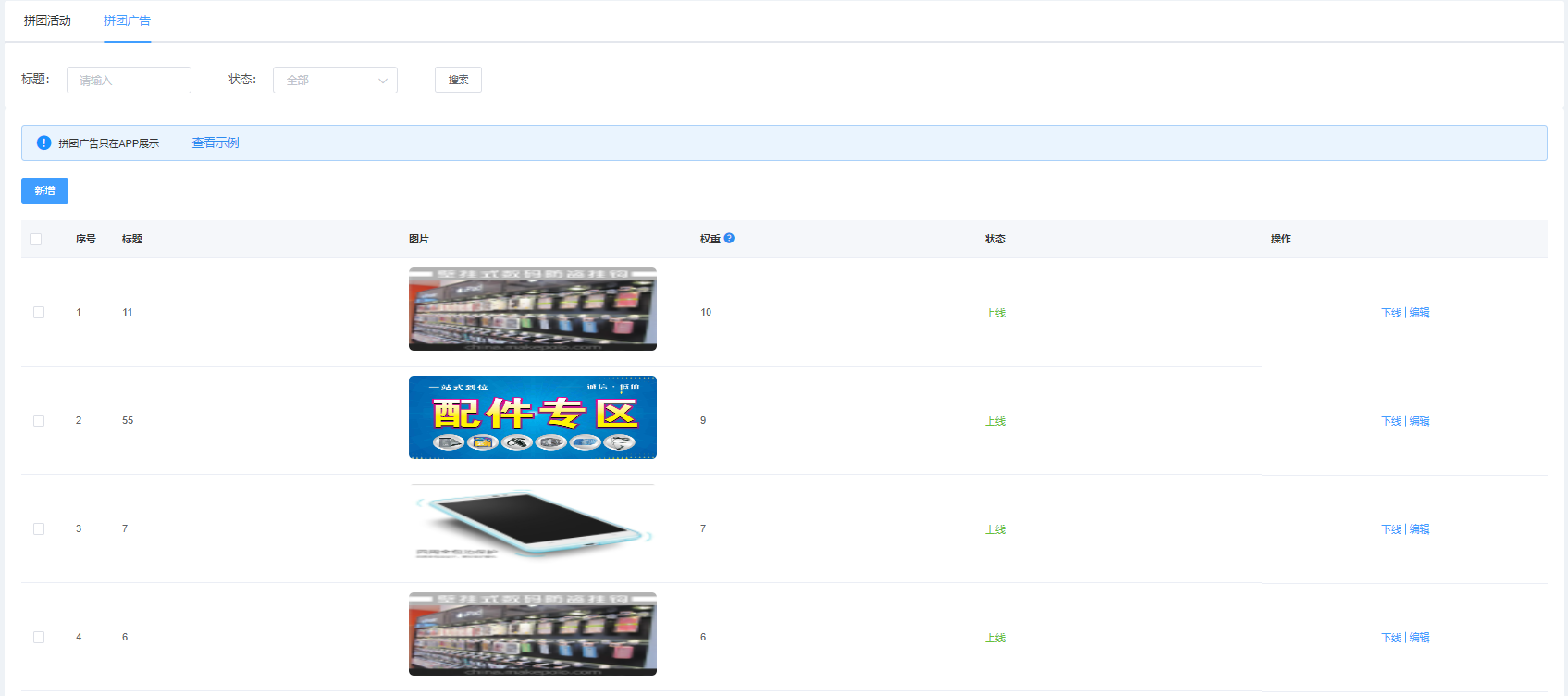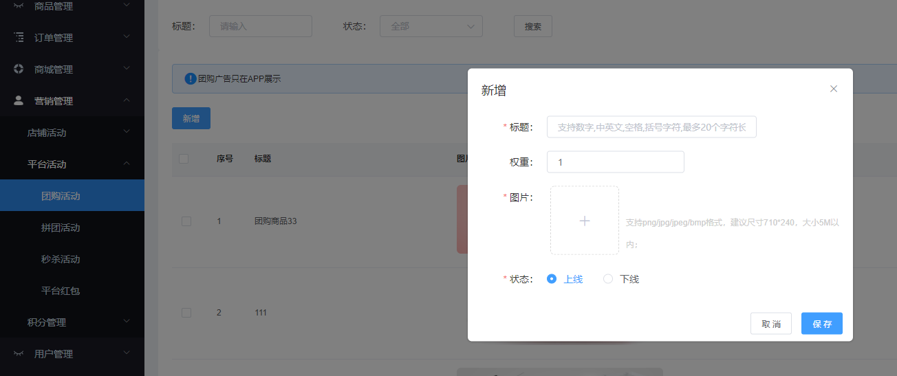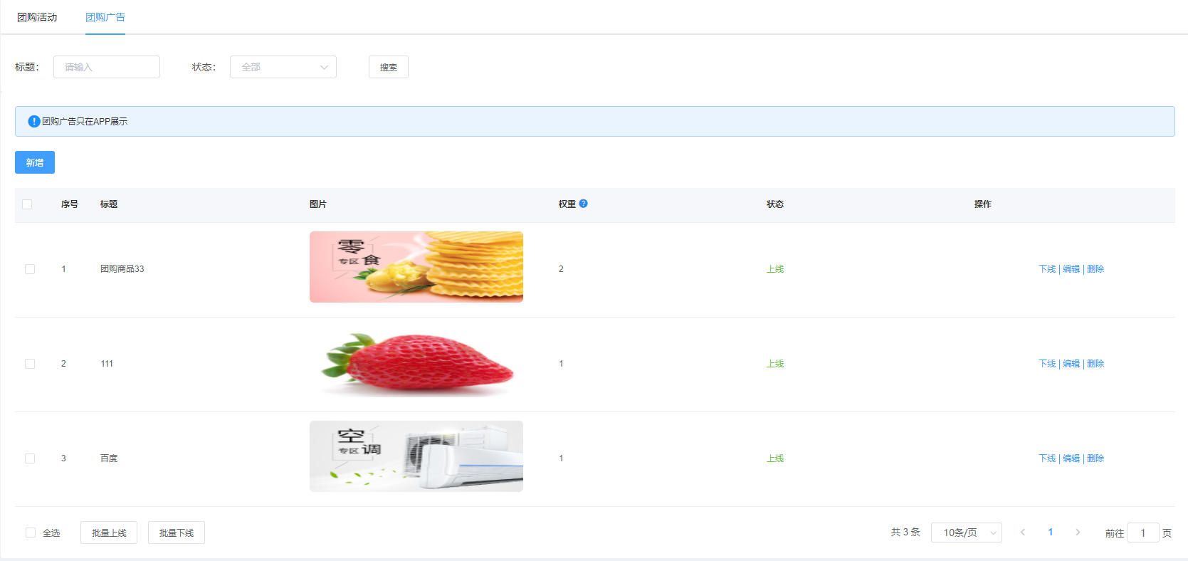 該页面对团购广告进行管理,可根据标题、状态进行搜索,可新增、上下线、编辑、删除、批量删除等操作