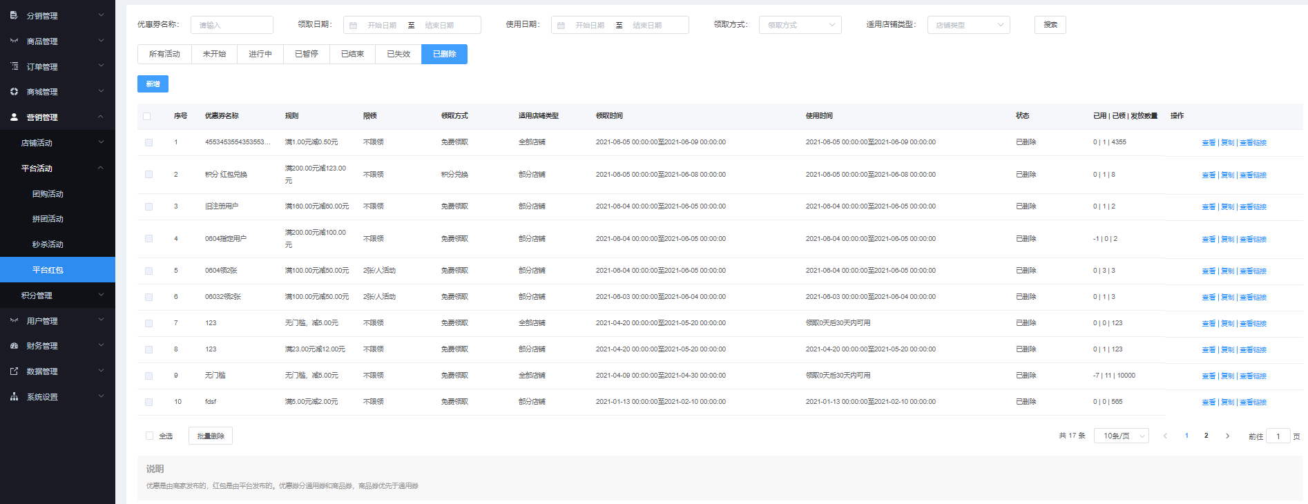 該页面对红包进行管理,可根据优惠券称、领券日期、使用日期、领取方式、适用店铺类型进行搜索,显示所有活动、未开始、进行中、已暂停、已结束、已失效、已删除。可新增、查看、查看链接、复制、暂停天、恢复、终止、批量删除等操作