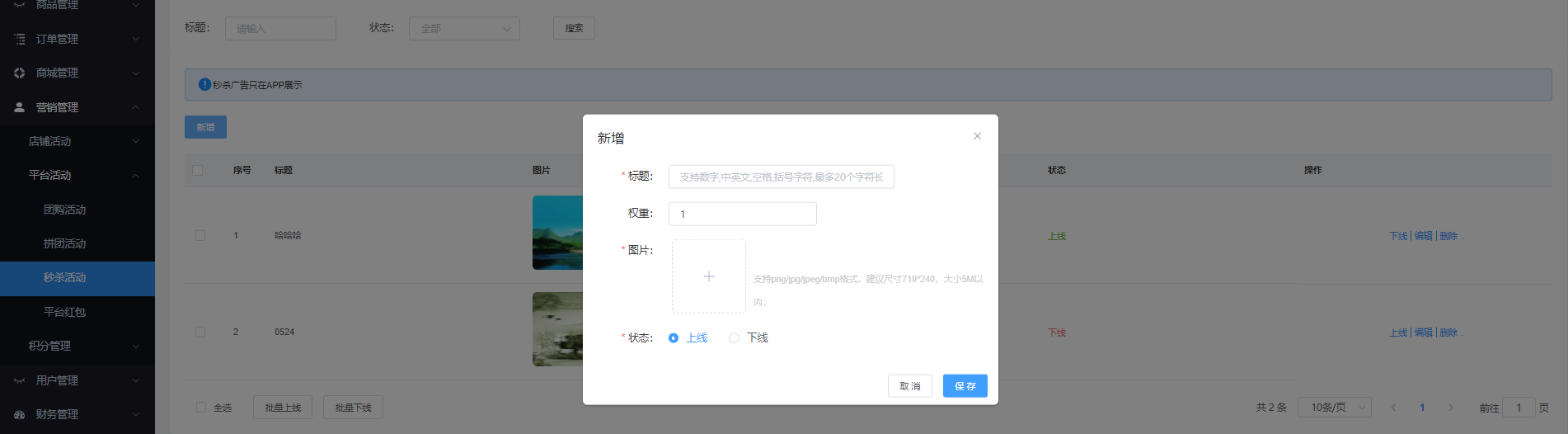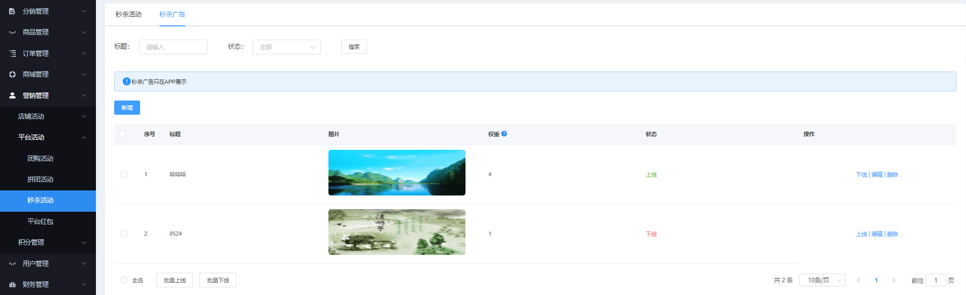 該页面对秒杀广告进行管理,可根据标题、状态进行搜索,可新增、上下线、编辑、删除、批量删除等操作