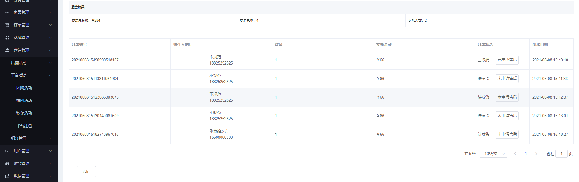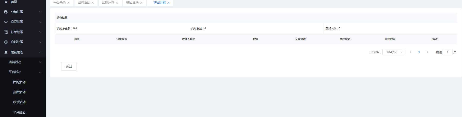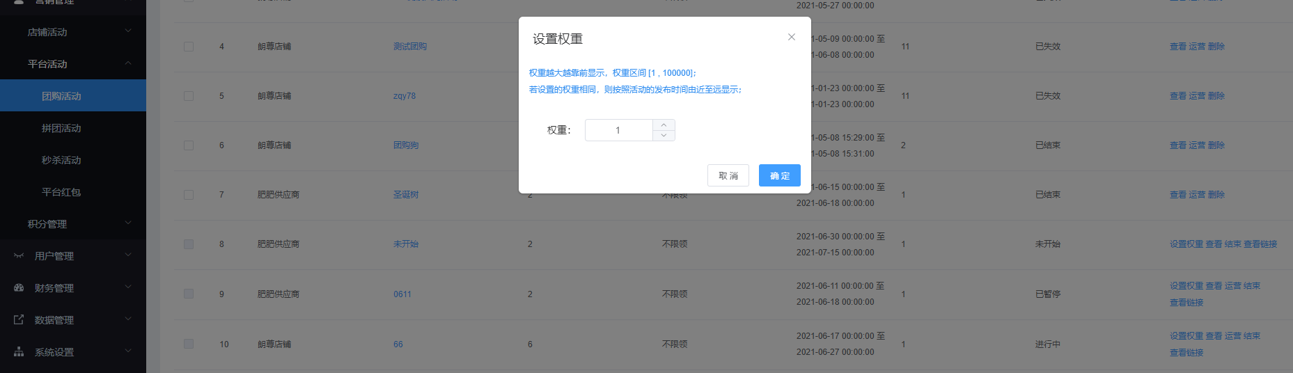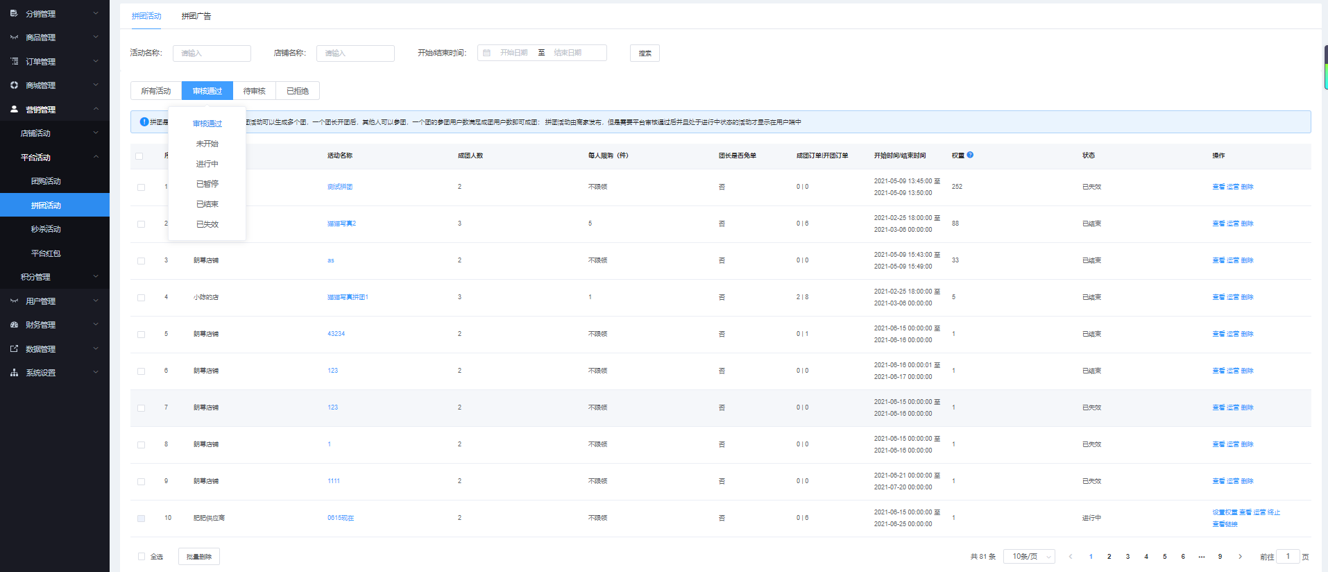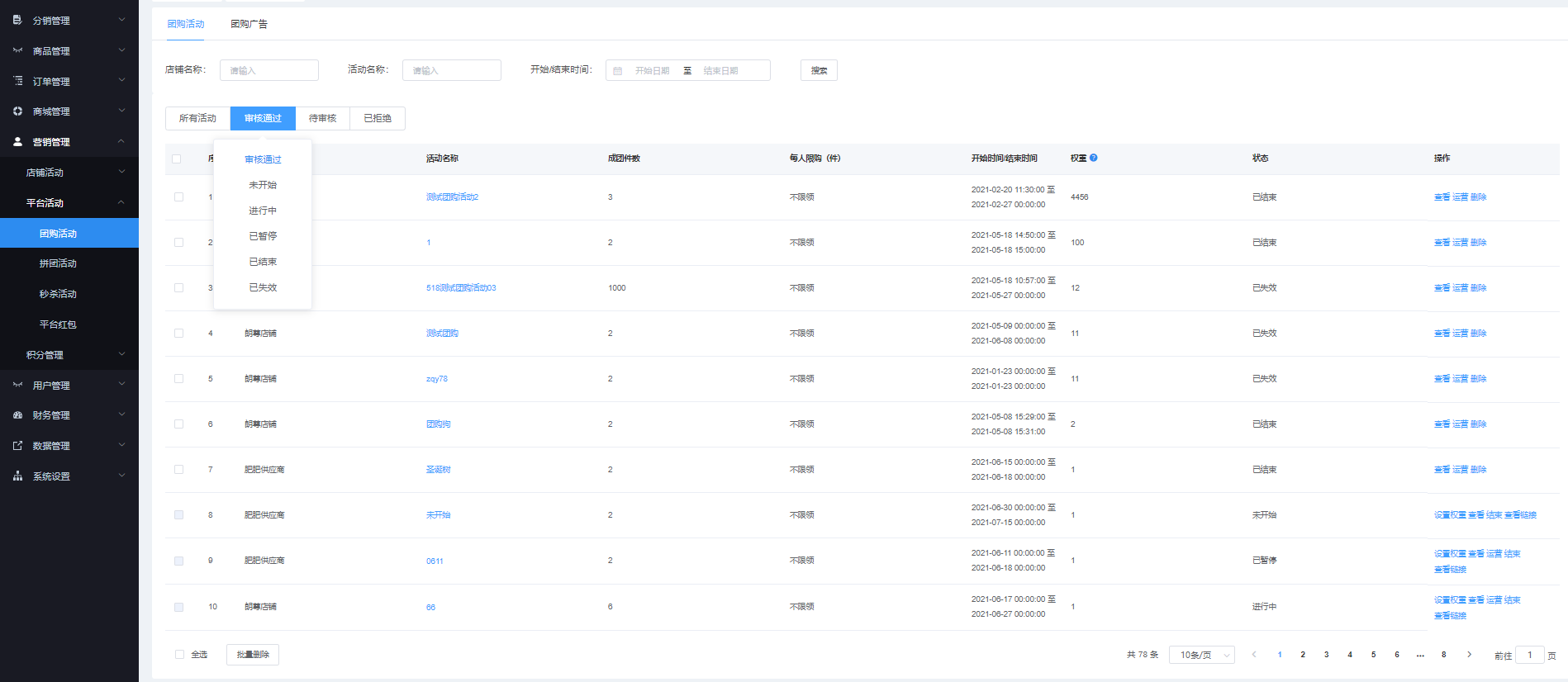 該页面对商家申请的拼团活动进行管理,可根据店铺名称、活动名称、开始/结束时间进行搜索,显示所有活动、、审核通过、待审核、已解决 状态。可查看、查看链接、结束、恢复、设置权限、批量、运营、删除、批量删除等操作