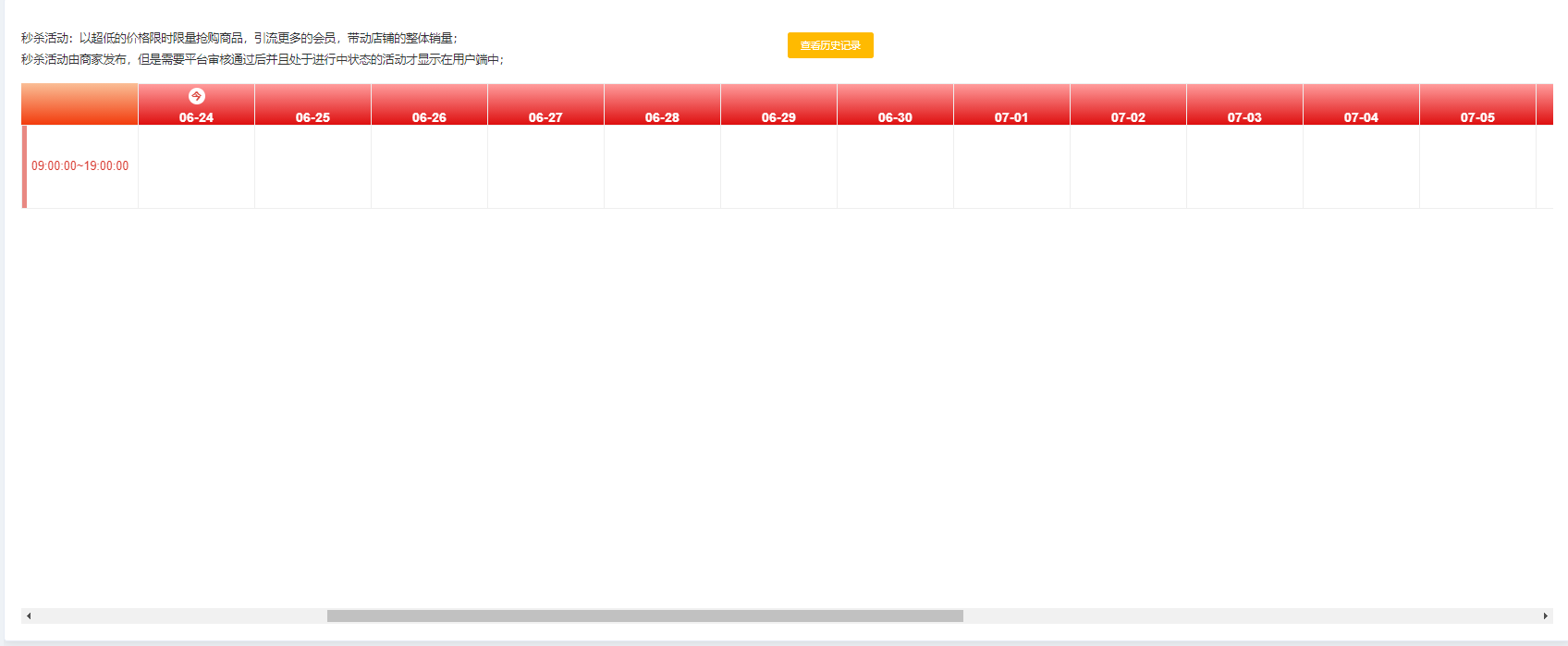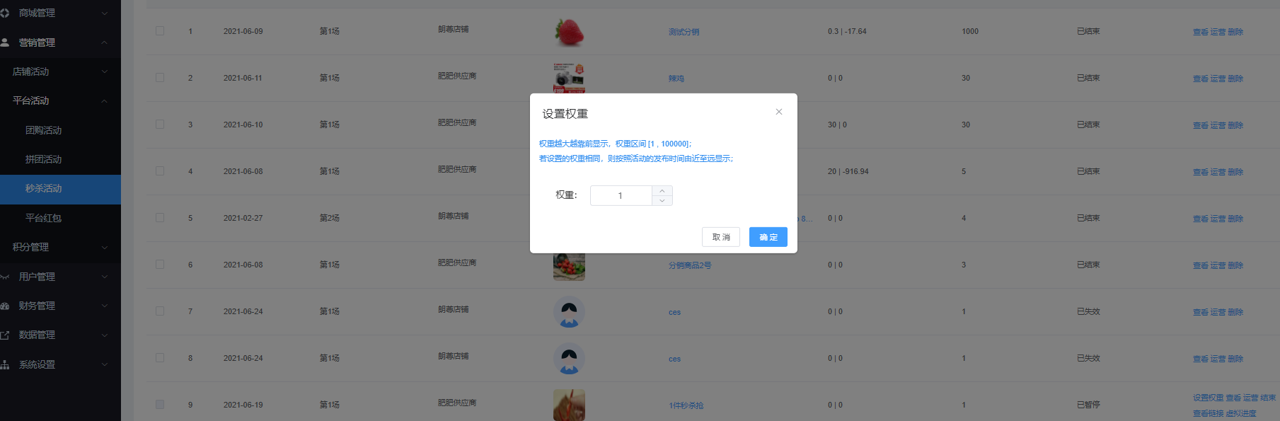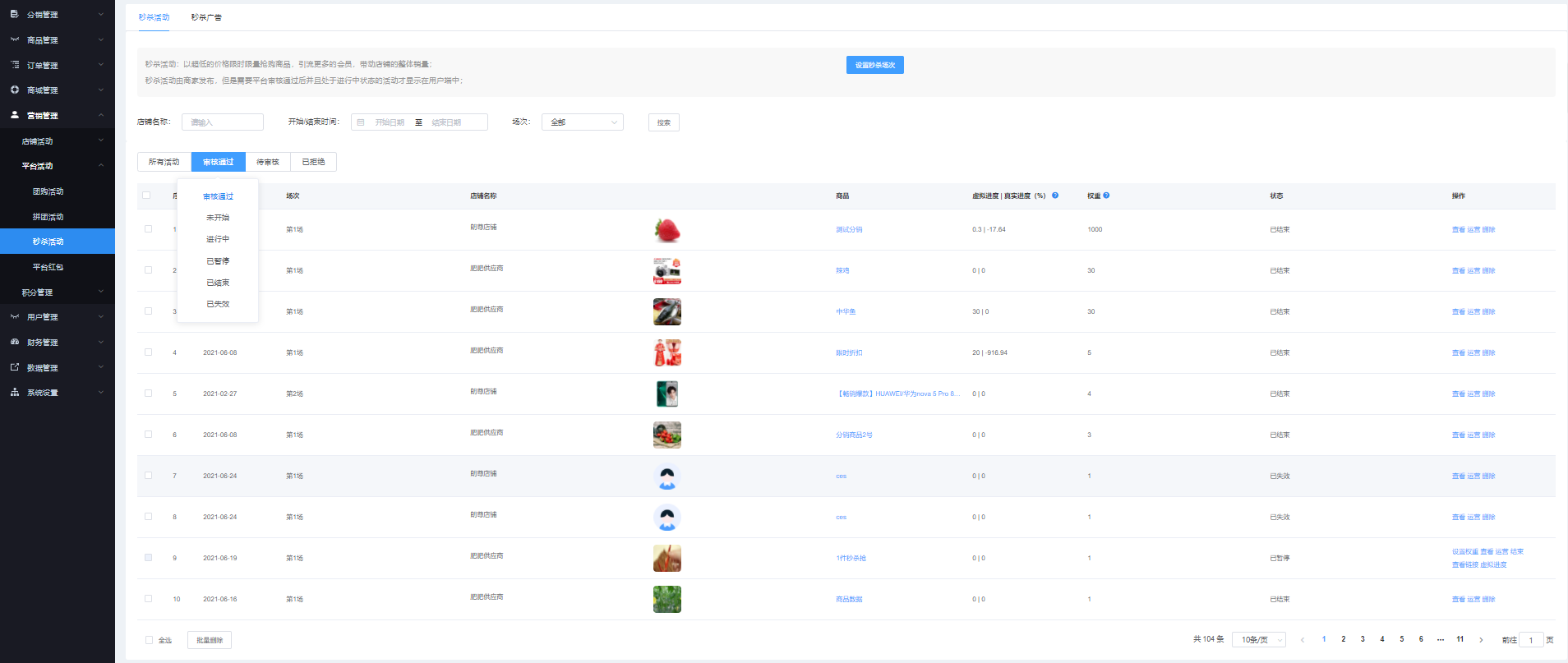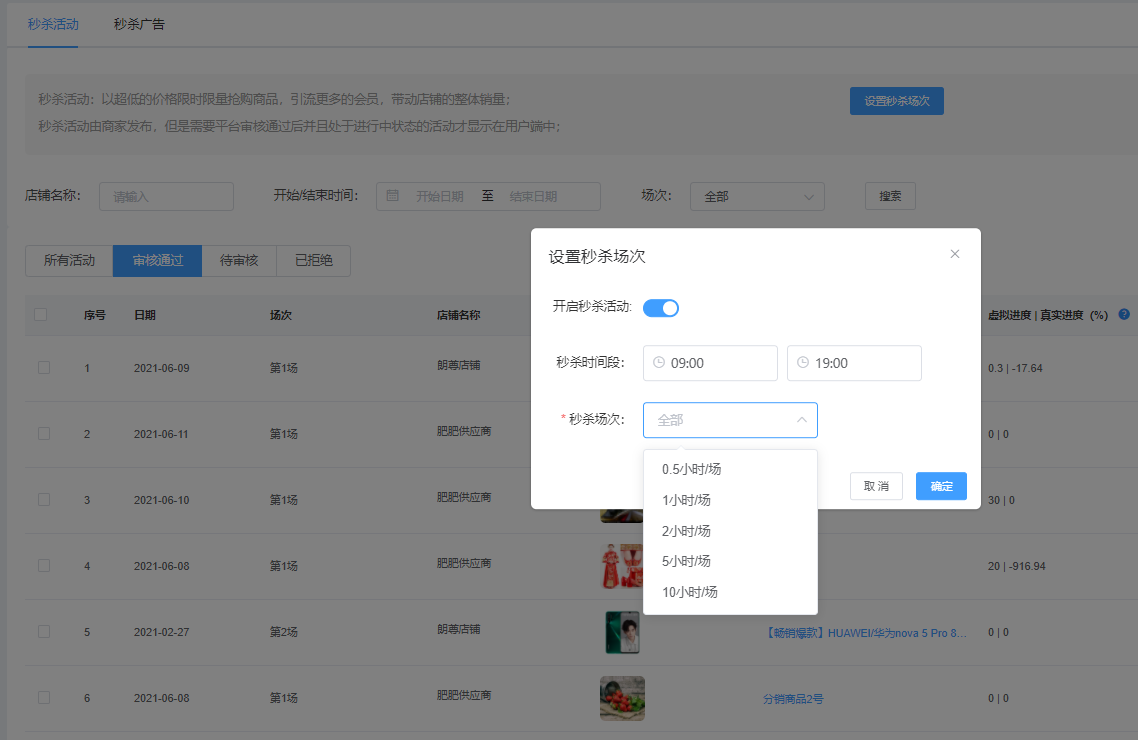該页面对商家申请的秒杀活动进行管理,可根据店铺名称、开始/结束时间进行搜索,显示所有活动、、审核通过、待审核、已解决 状态。可设置场次、查看、查看链接、结束、恢复、设置权限、虚拟进度、运营、删除、批量删除等操作