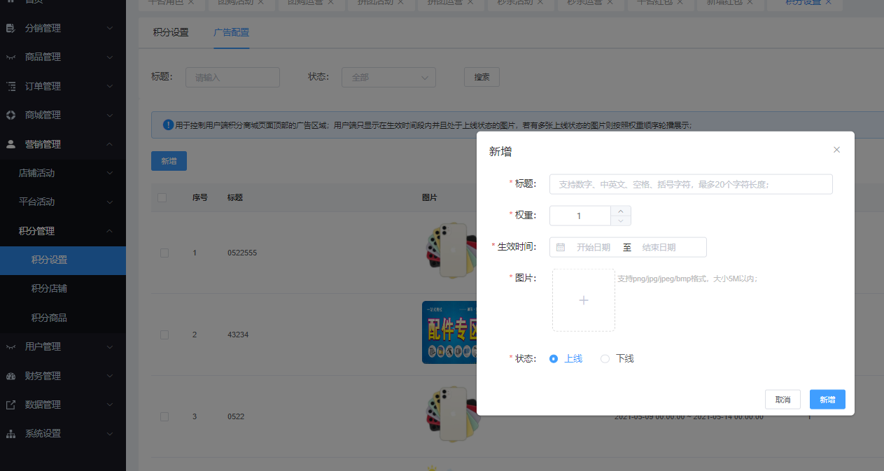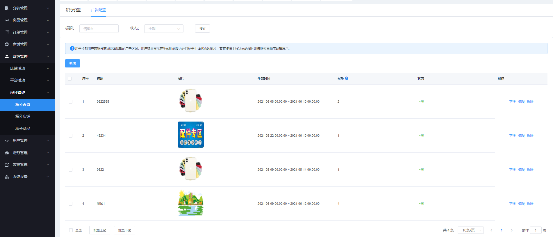 该页面可设置广告配置,可通过“标题”、“状态”进行搜索,可新增、上下线、删除、批量上下线操作。