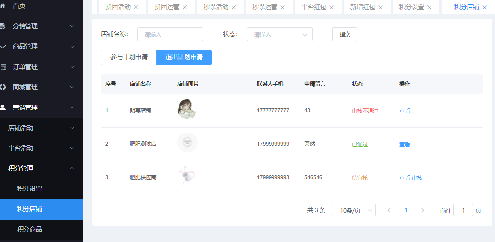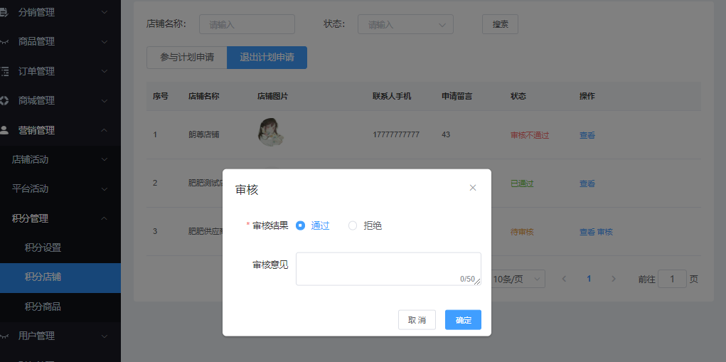 该页面管理申请参与积分活动的店铺,可通过“店铺名称”、“状态”进行搜索,显示参与计划申请、退出计划申请的所有店铺 可查看、审核操作。