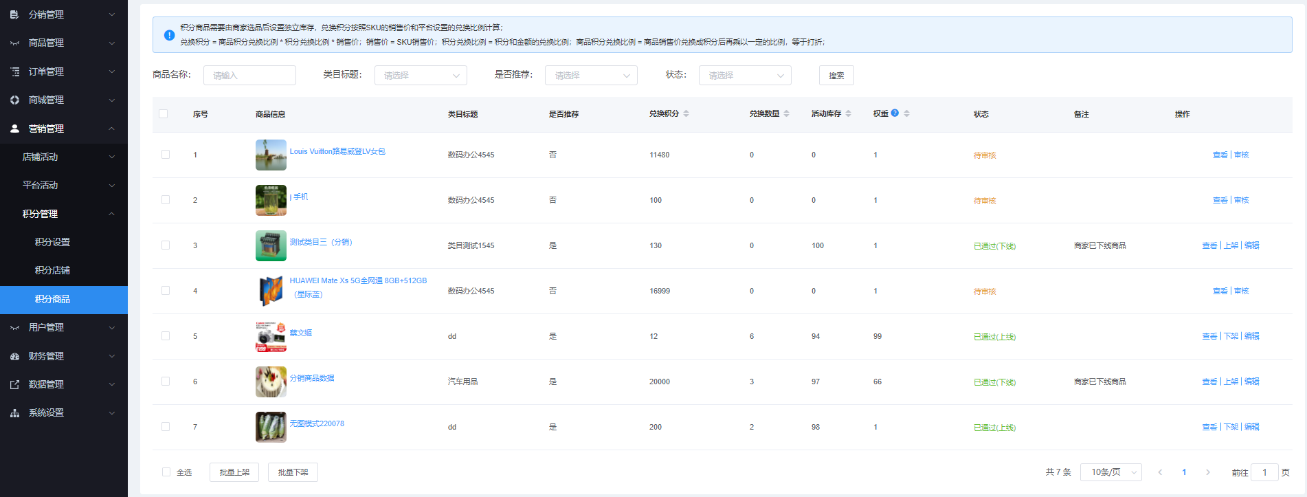 该页面对所有参与积分的活动的商品进行管理,可通过“店铺名称”、“类目标题”、“是否推荐”、“状态”进行搜索, 可查看、审核、编辑、上下架、批量上下架等操作。