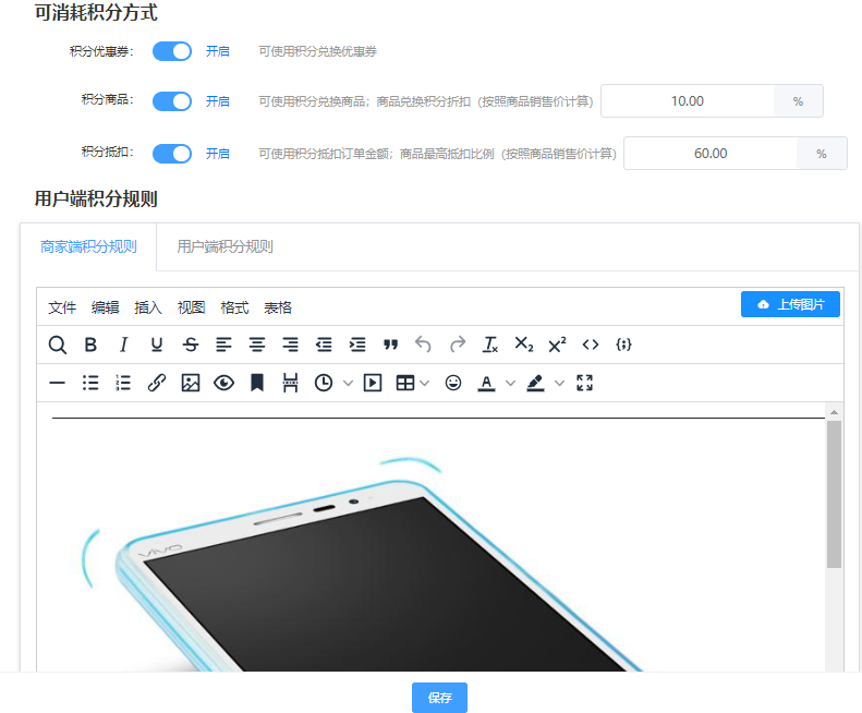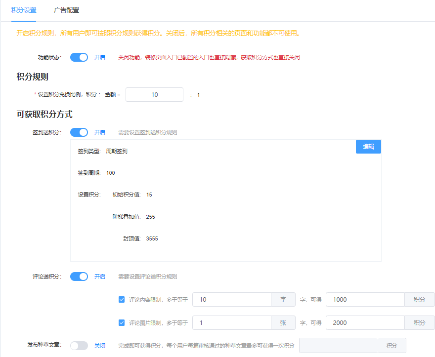 该页面可设置积分的规则,可开启、关闭 编辑等操作