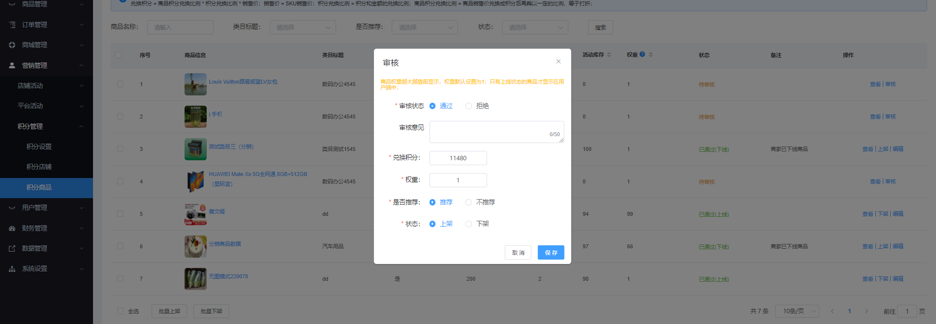 动作:审核-选择“审核状态”-填写“审核意见”输入“兑换积分”-输入“权重”-选择“是否推荐”-选择“状态”