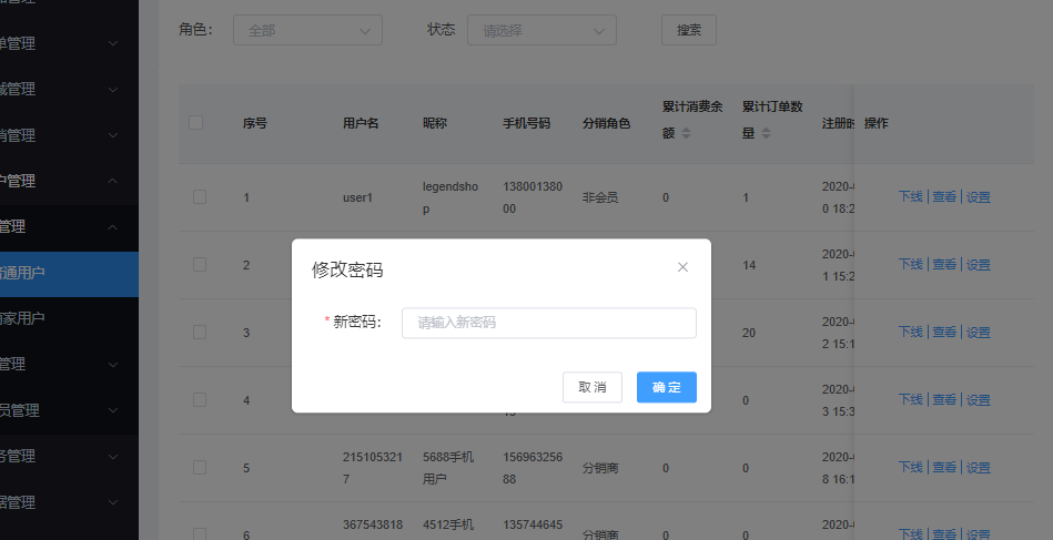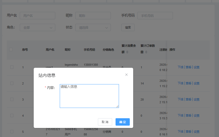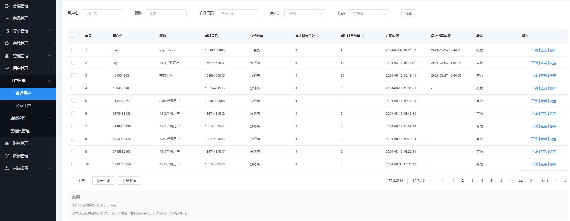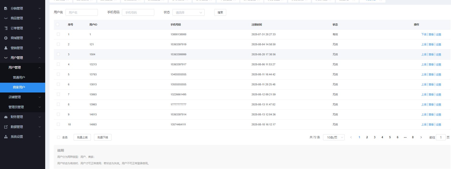 该页面管理所有商家用户,可通过“用户名”、“手机号码”、“状态”对用户信息进行查看、设置、上下线、批量上下线、修改密码、发送站内消息等操作