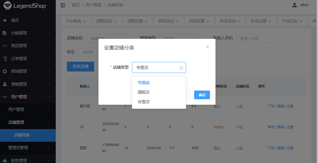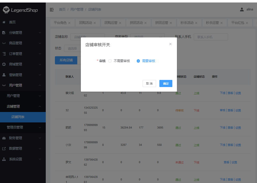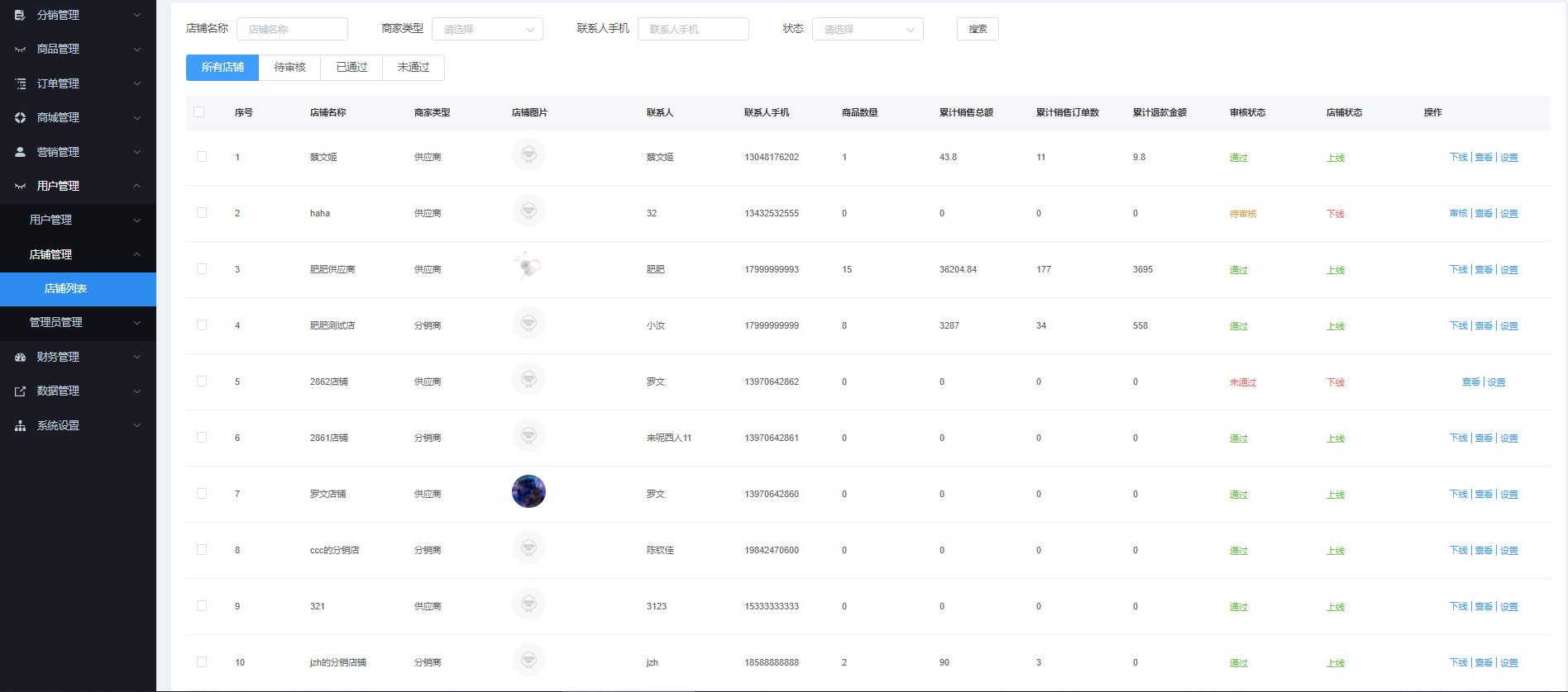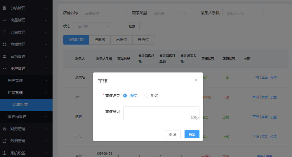 该页面管理所有店铺,可通过“店铺名称”、“上海类型”、“联系手机号”、“状态”进行搜索,显示所有店铺、待审核、已通过、为通过状态的店铺。对用户信息进行查看、上下线、批量上下线、批量审核、修改店铺类型、编辑商品审核等操作