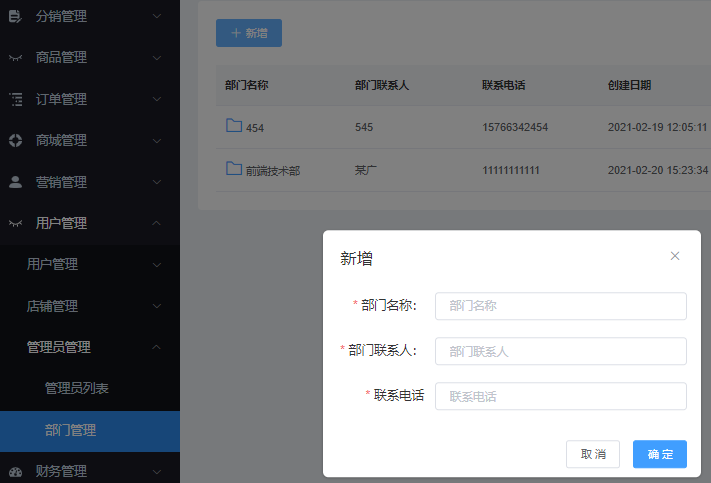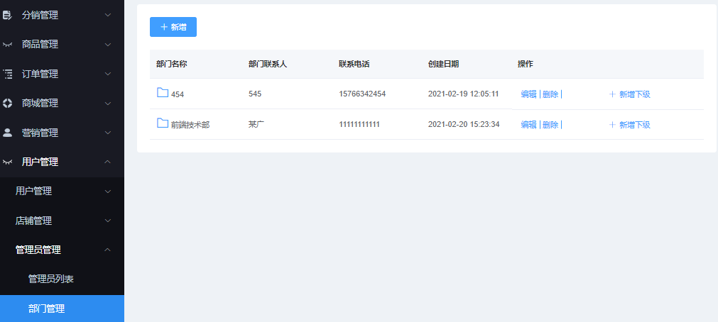 该页面管理部门,可新增、编辑、新增下级、删除等操作