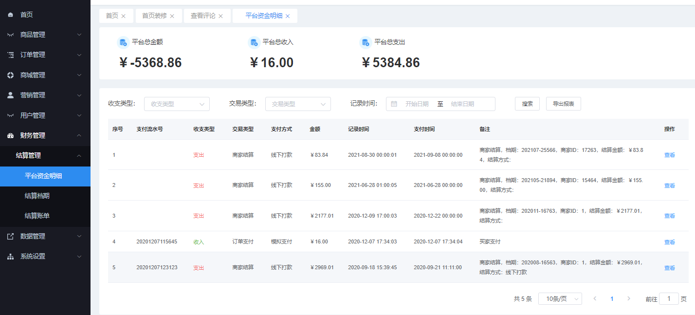 改页面能查看走资金的收入及支出可通过 收支类型、交易类型、记录时间搜索 可导出数据
