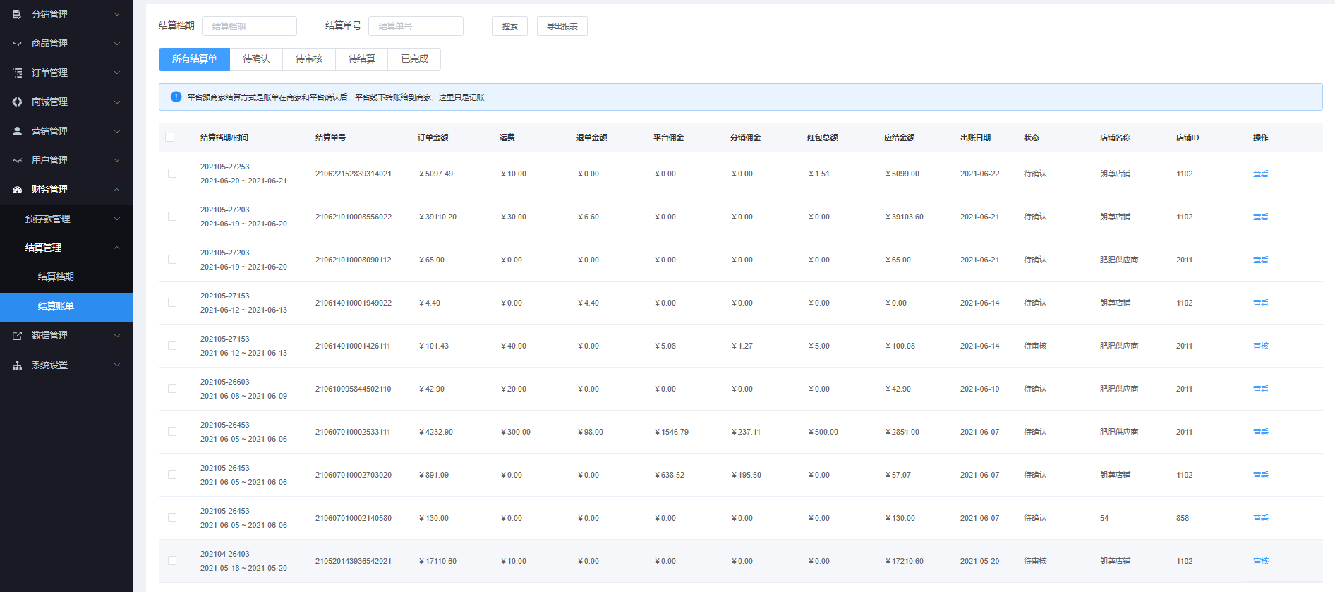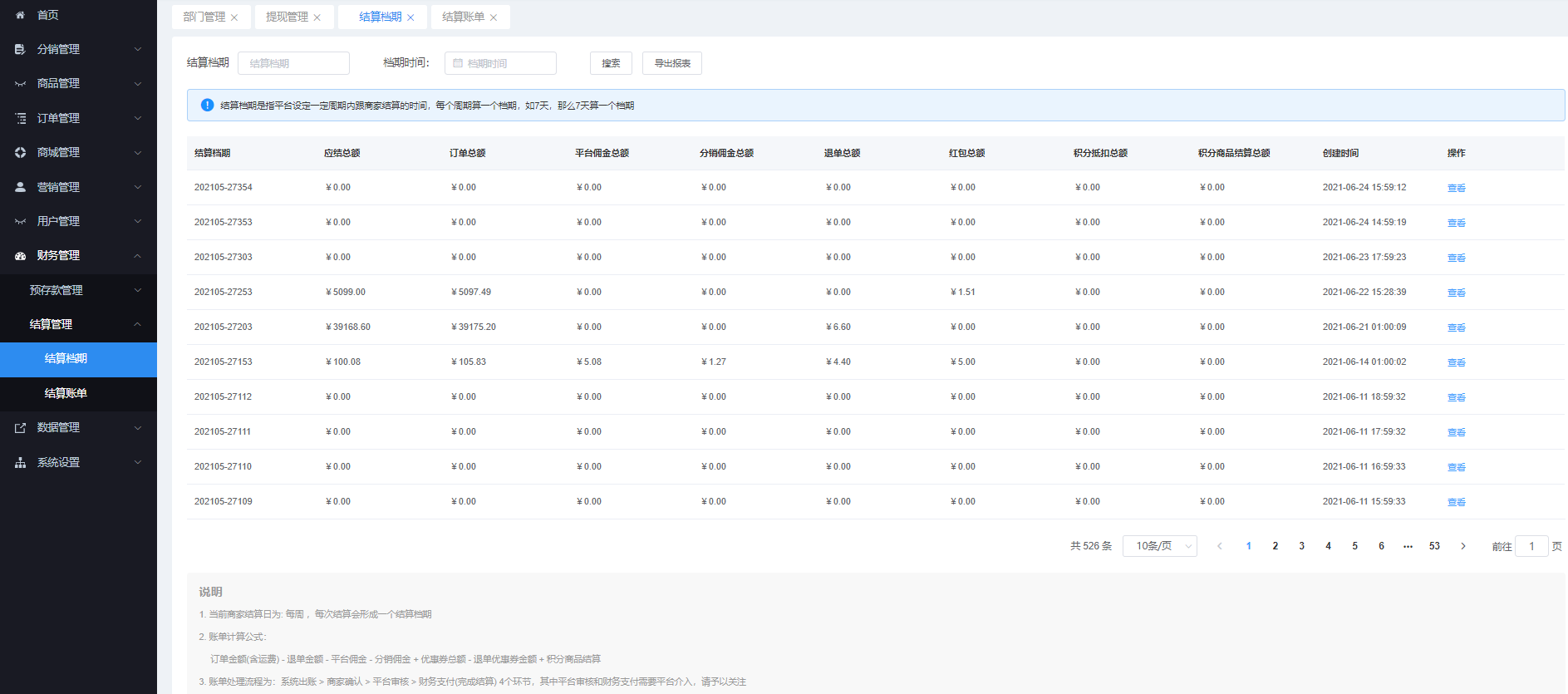 该页面管理展示所有商家的账单,可根据“结算档期”、“档期单号”搜索可,能导出报表数据。点击“查看”账单数据